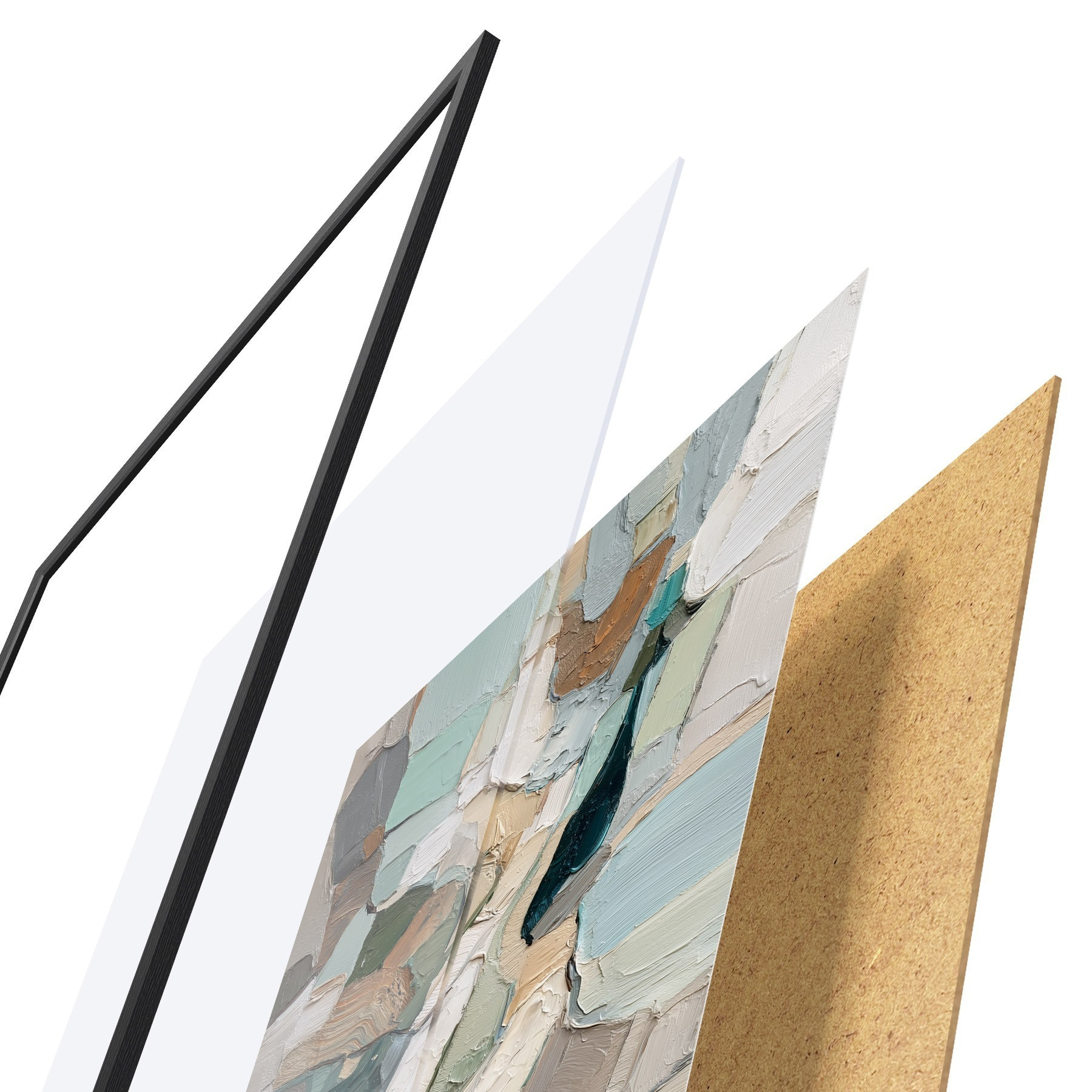 Das Poster besteht aus einem Rahmen, Plexiglas, einem gedruckten Bild und einer Rückwand aus Spanplatten. Dank der Halterungen auf der Rückseite kann das Poster sofort an die Wand gehängt werden.
