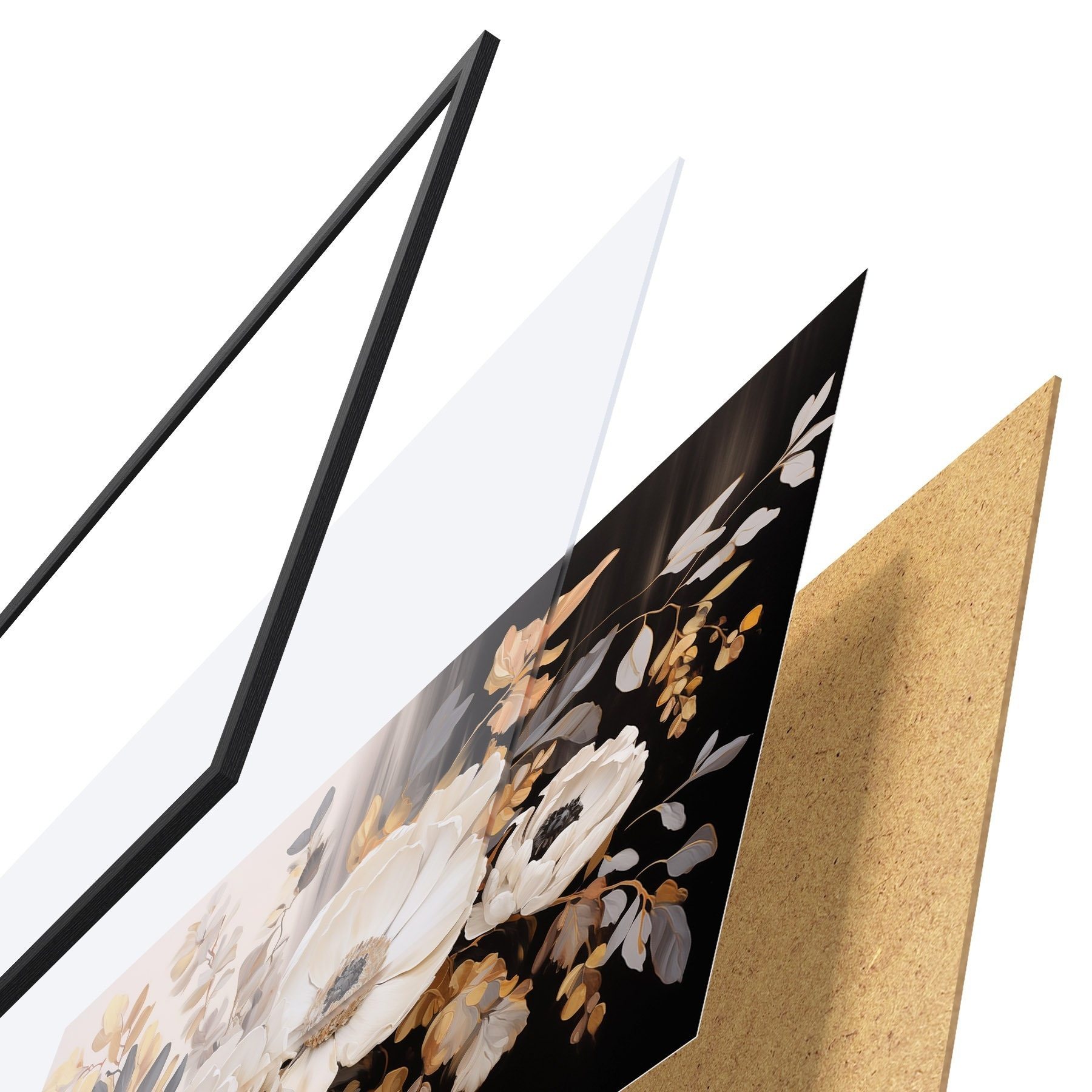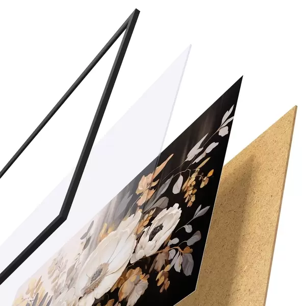 Das Poster besteht aus einem Rahmen, Plexiglas, einem gedruckten Bild und einer Rückwand aus Spanplatten. Dank der Halterungen auf der Rückseite kann das Poster sofort an die Wand gehängt werden.