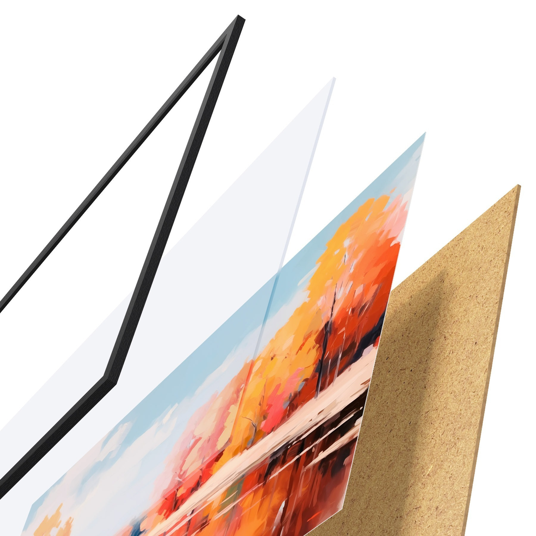 Das Poster besteht aus einem Rahmen, Plexiglas, einem gedruckten Bild und einer Rückwand aus Spanplatten. Dank der Halterungen auf der Rückseite kann das Poster sofort an die Wand gehängt werden.