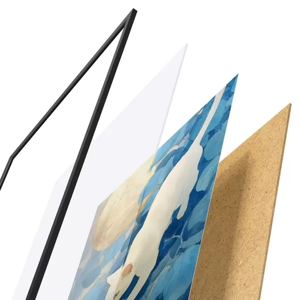 Das Poster besteht aus einem Rahmen, Plexiglas, einem gedruckten Bild und einer Rückwand aus Spanplatten. Dank der Halterungen auf der Rückseite kann das Poster sofort an die Wand gehängt werden.