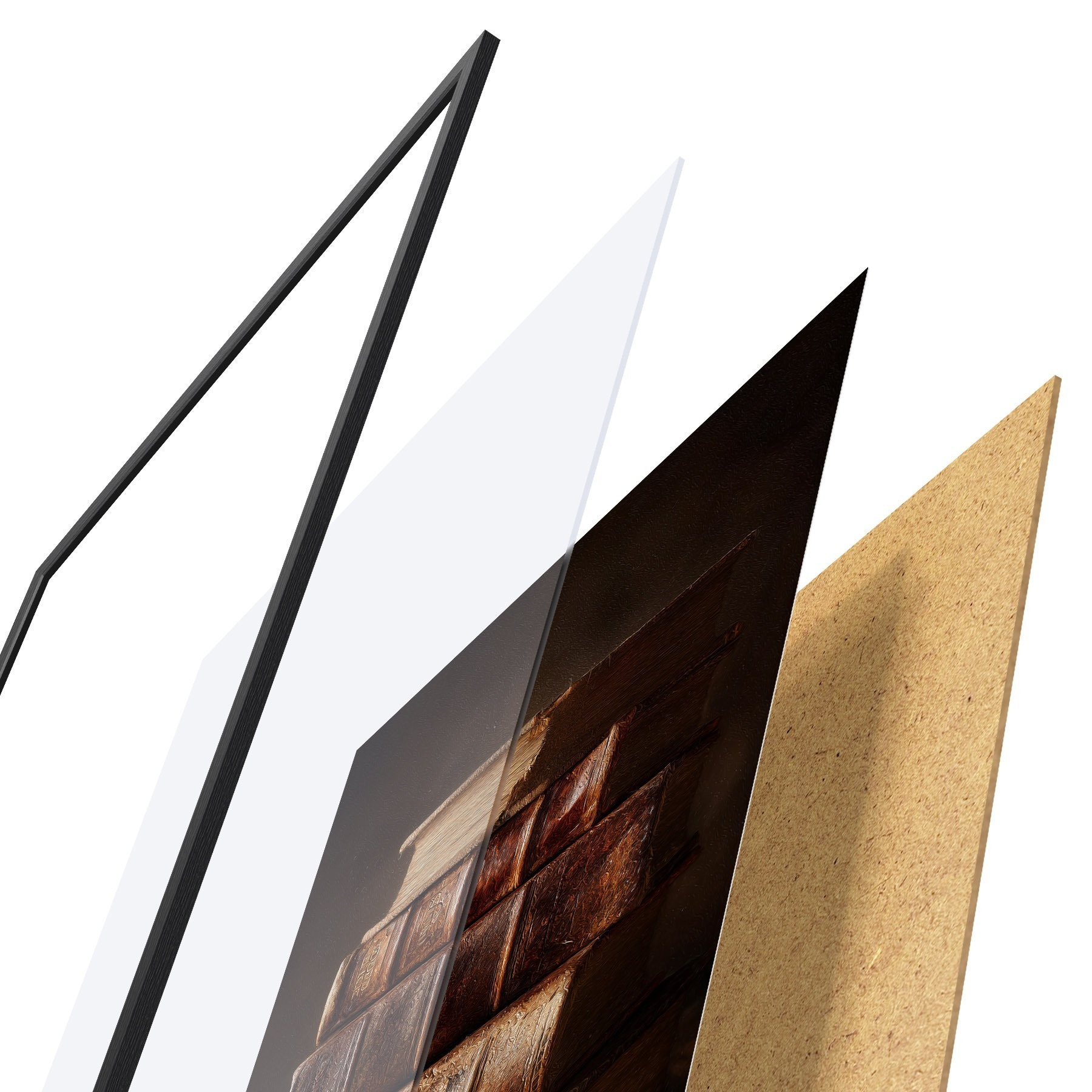 Das Poster besteht aus einem Rahmen, Plexiglas, einem gedruckten Bild und einer Rückwand aus Spanplatten. Dank der Halterungen auf der Rückseite kann das Poster sofort an die Wand gehängt werden.