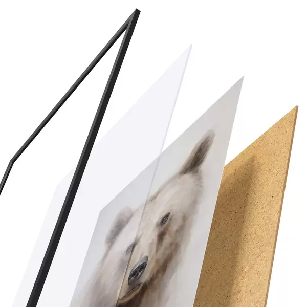 Das Poster besteht aus einem Rahmen, Plexiglas, einem gedruckten Bild und einer Rückwand aus Spanplatten. Dank der Halterungen auf der Rückseite kann das Poster sofort an die Wand gehängt werden.