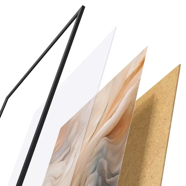 Das Poster besteht aus einem Rahmen, Plexiglas, einem gedruckten Bild und einer Rückwand aus Spanplatten. Dank der Halterungen auf der Rückseite kann das Poster sofort an die Wand gehängt werden.