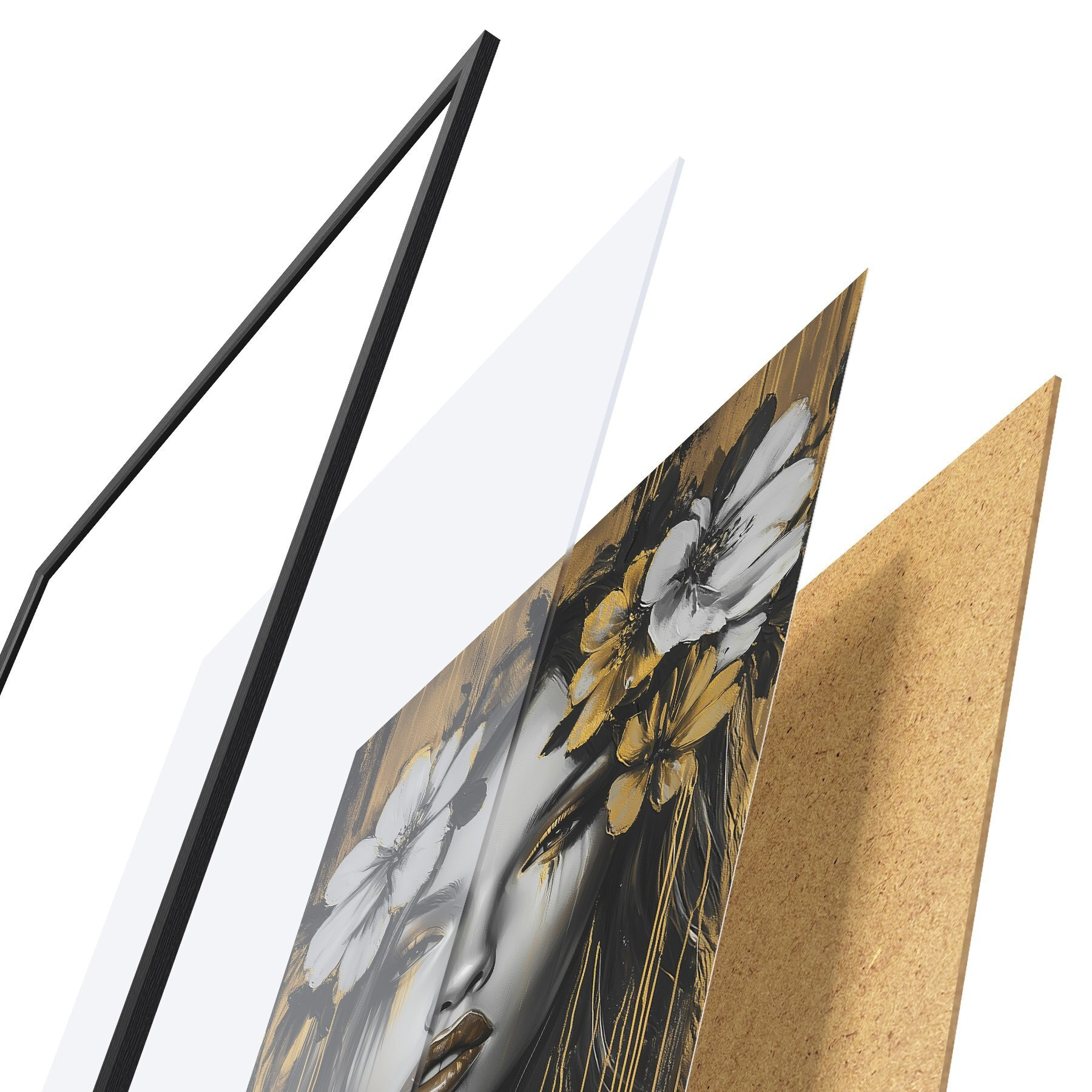 Das Poster besteht aus einem Rahmen, Plexiglas, einem gedruckten Bild und einer Rückwand aus Spanplatten. Dank der Halterungen auf der Rückseite kann das Poster sofort an die Wand gehängt werden.