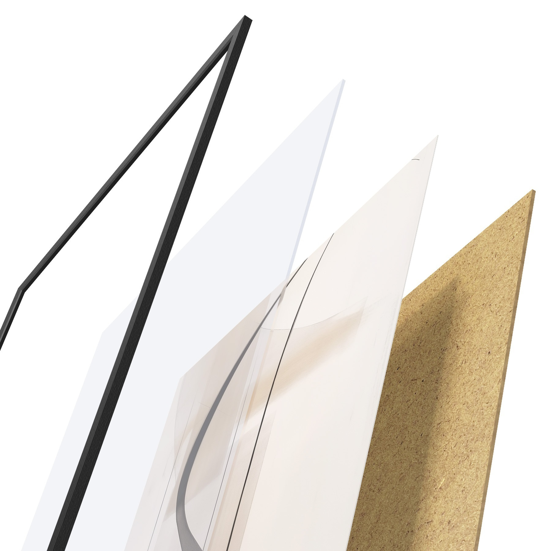 Das Poster besteht aus einem Rahmen, Plexiglas, einem gedruckten Bild und einer Rückwand aus Spanplatten. Dank der Halterungen auf der Rückseite kann das Poster sofort an die Wand gehängt werden.