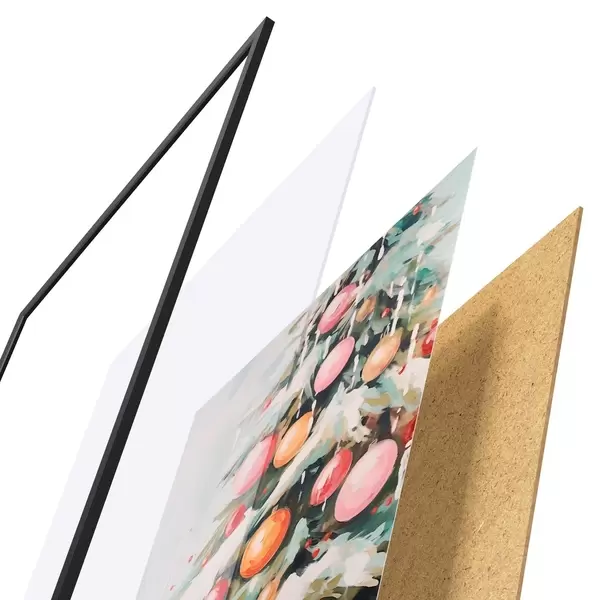 Das Poster besteht aus einem Rahmen, Plexiglas, einem gedruckten Bild und einer Rückwand aus Spanplatten. Dank der Halterungen auf der Rückseite kann das Poster sofort an die Wand gehängt werden.