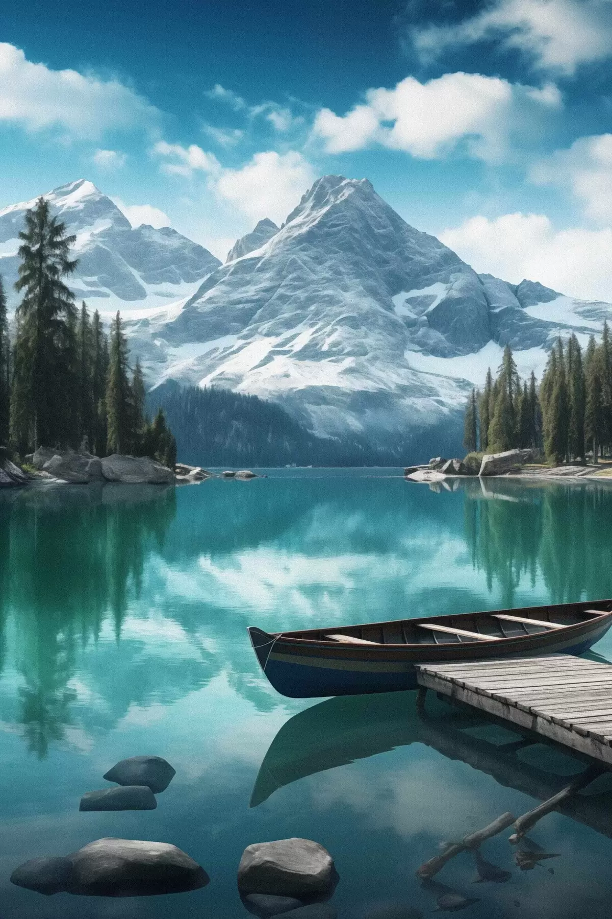 Poster Alpensee mit Kanu und schneebedeckten Gipfeln f46481
