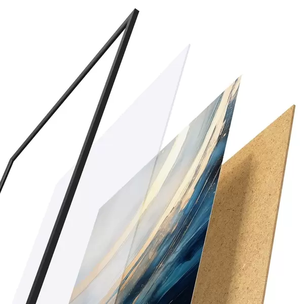 Das Poster besteht aus einem Rahmen, Plexiglas, einem gedruckten Bild und einer Rückwand aus Spanplatten. Dank der Halterungen auf der Rückseite kann das Poster sofort an die Wand gehängt werden.