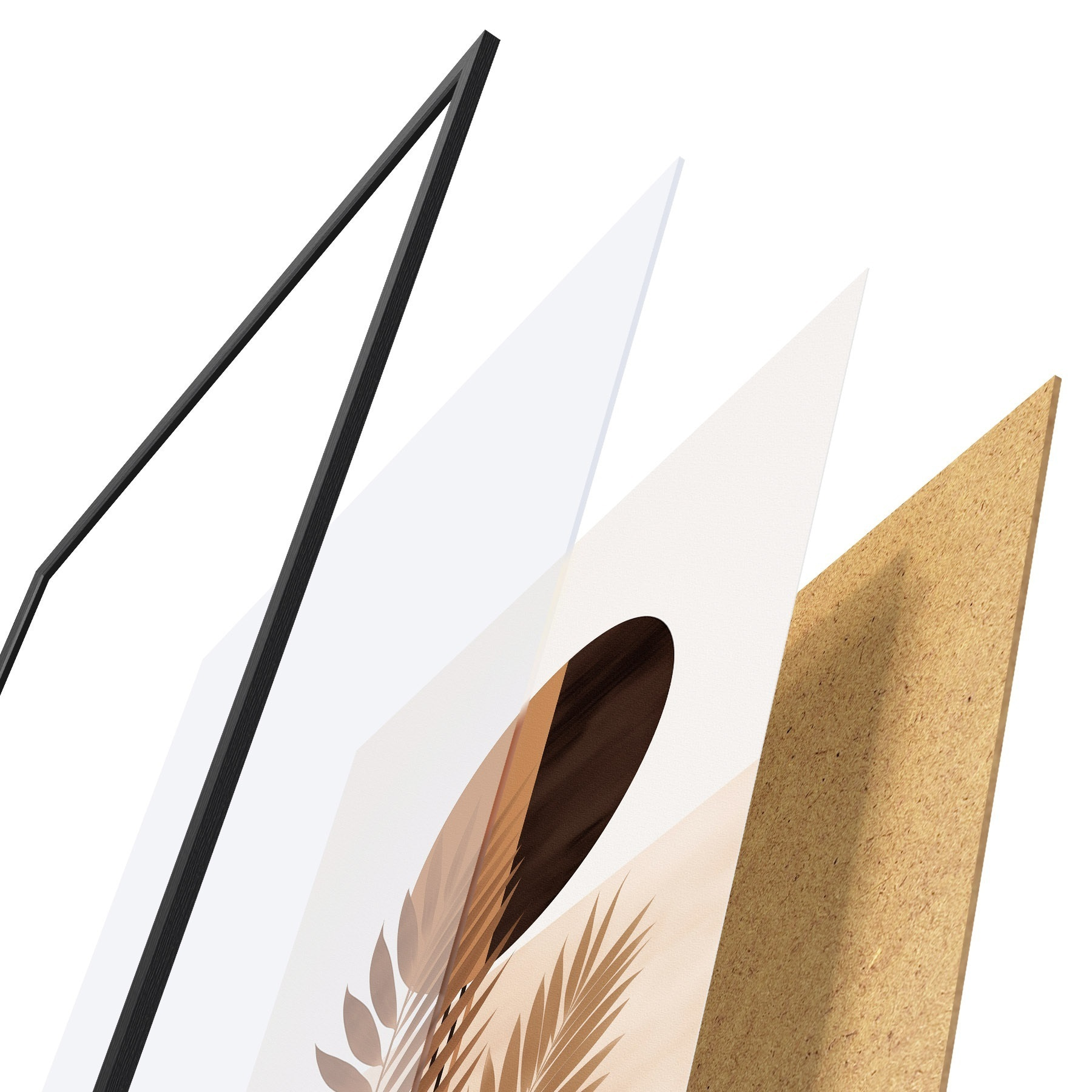 Das Poster besteht aus einem Rahmen, Plexiglas, einem gedruckten Bild und einer Rückwand aus Spanplatten. Dank der Halterungen auf der Rückseite kann das Poster sofort an die Wand gehängt werden.