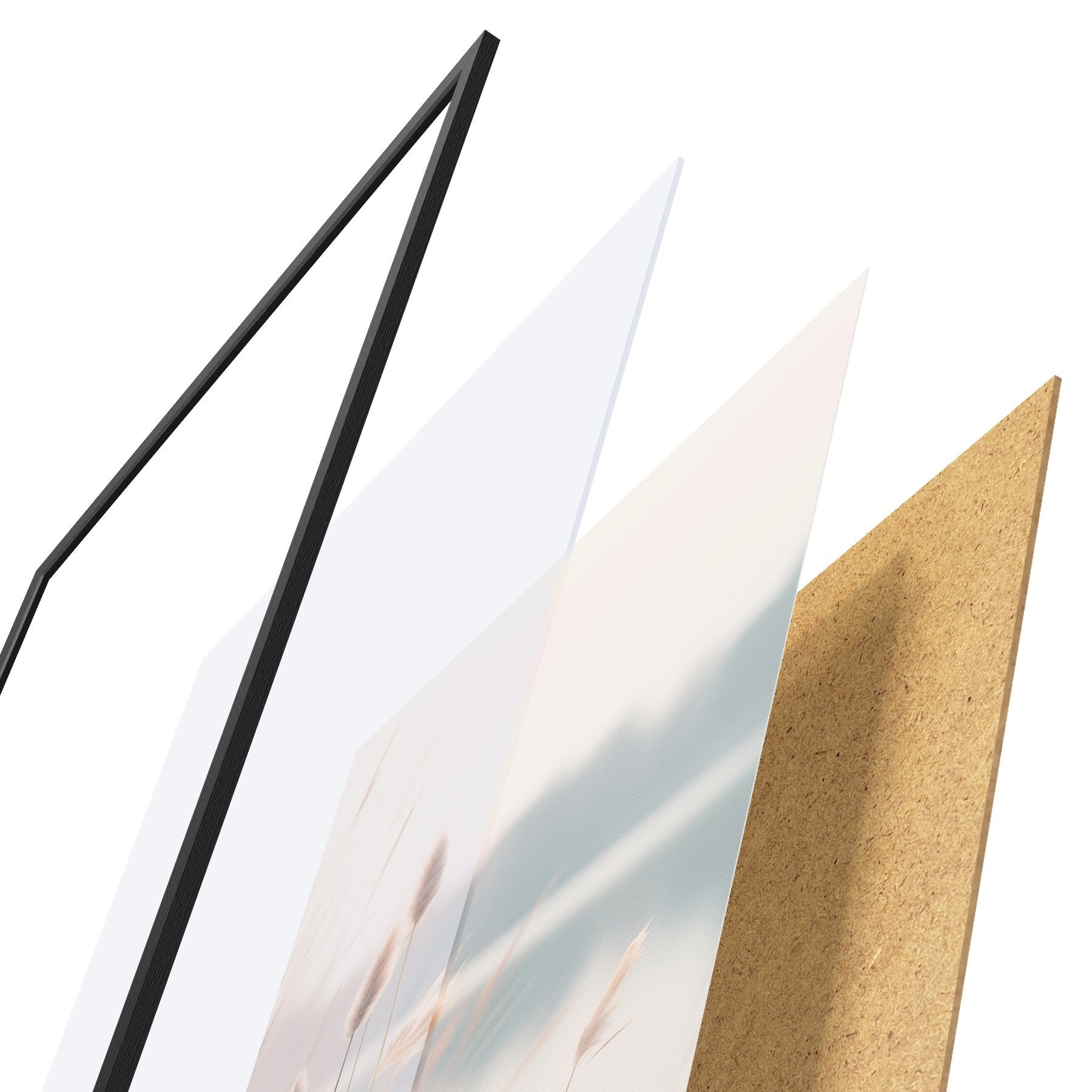 Das Poster besteht aus einem Rahmen, Plexiglas, einem gedruckten Bild und einer Rückwand aus Spanplatten. Dank der Halterungen auf der Rückseite kann das Poster sofort an die Wand gehängt werden.