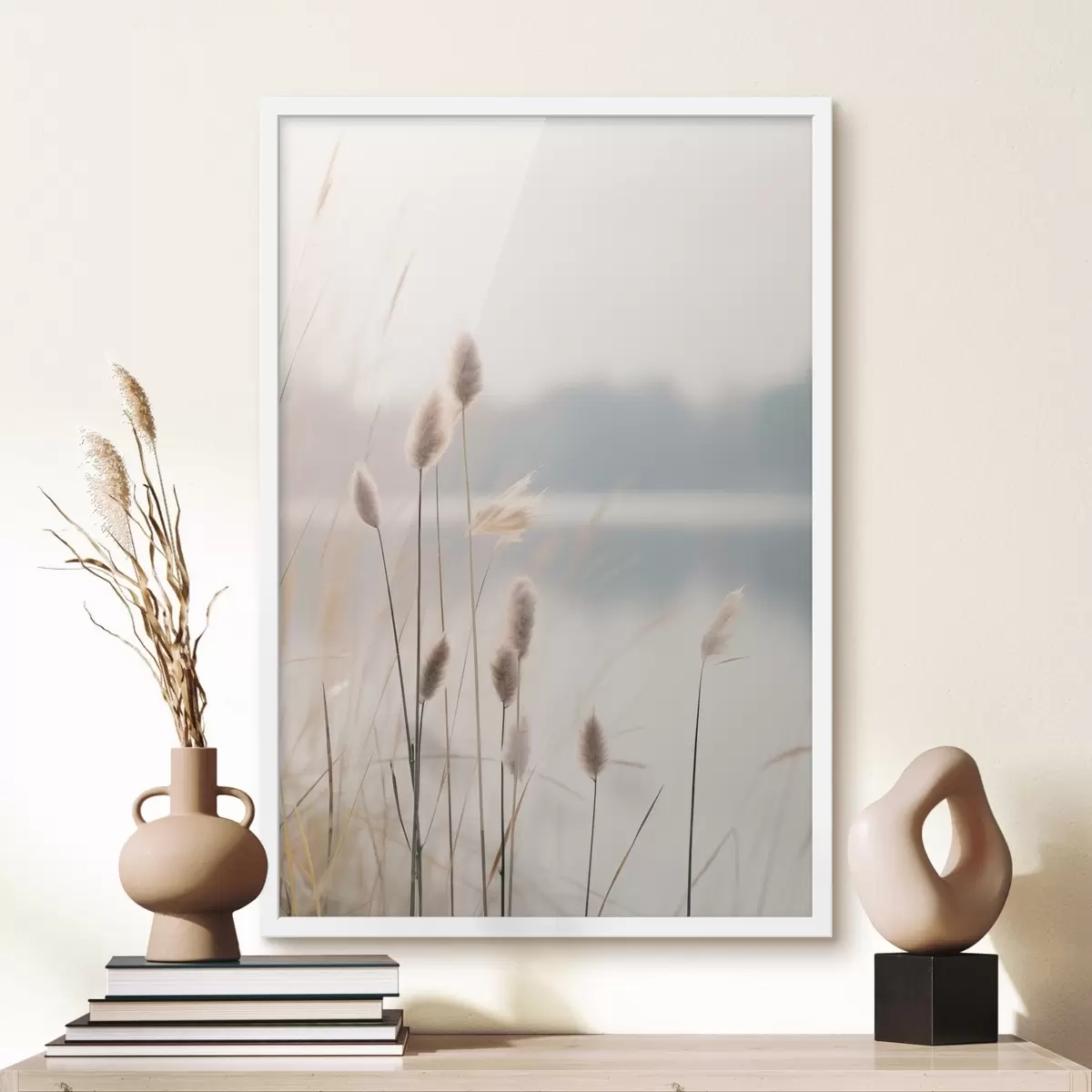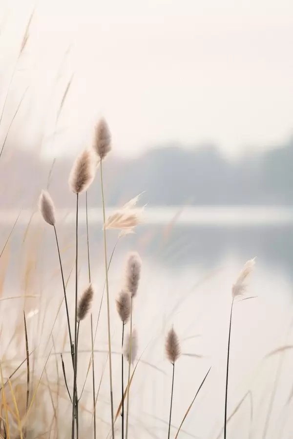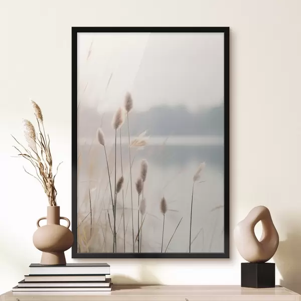 Poster Weiche Schilfrohre an einem nebligen Seeufer, pastellbeige Farbtöne Nr f46504
