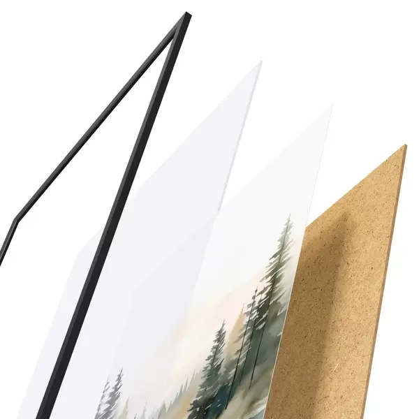 Das Poster besteht aus einem Rahmen, Plexiglas, einem gedruckten Bild und einer Rückwand aus Spanplatten. Dank der Halterungen auf der Rückseite kann das Poster sofort an die Wand gehängt werden.