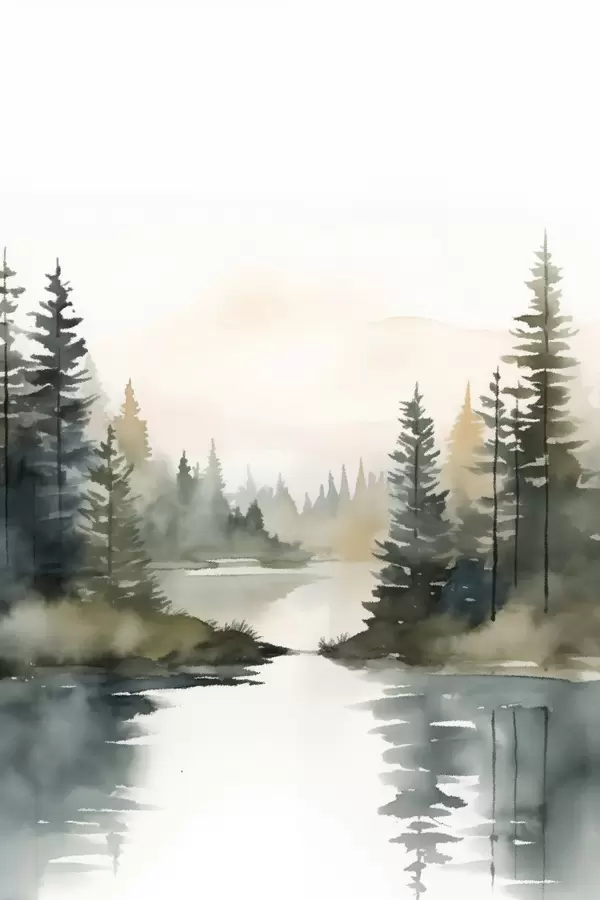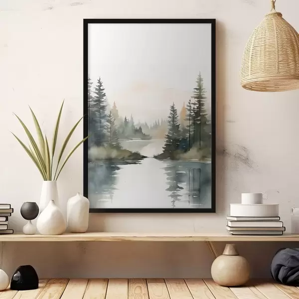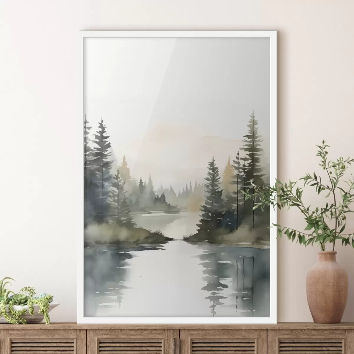 Poster Nebelverhangener Nadelwald über einem ruhigen Fluss, Aquarellstil Nr f46507