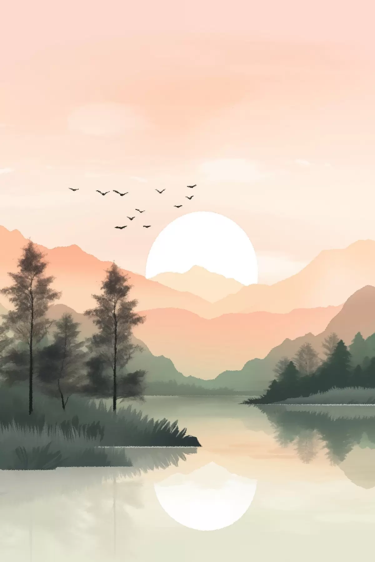 Poster Pastellfarbener Sonnenuntergang über einem ruhigen See mit fernen Hügeln und Vögeln Nr f46508