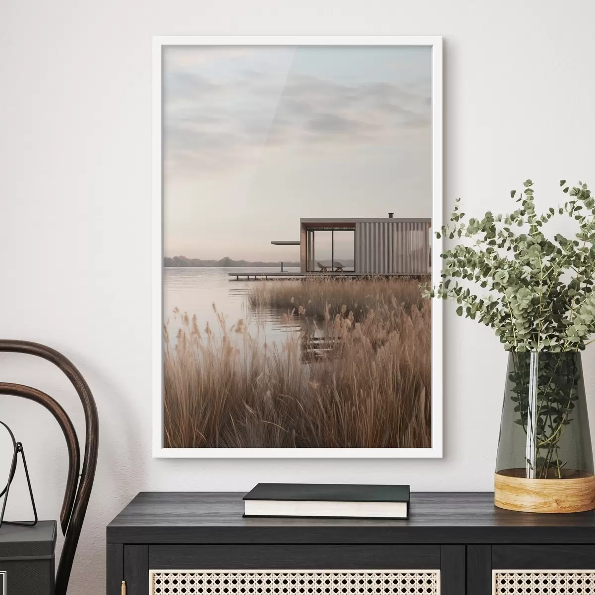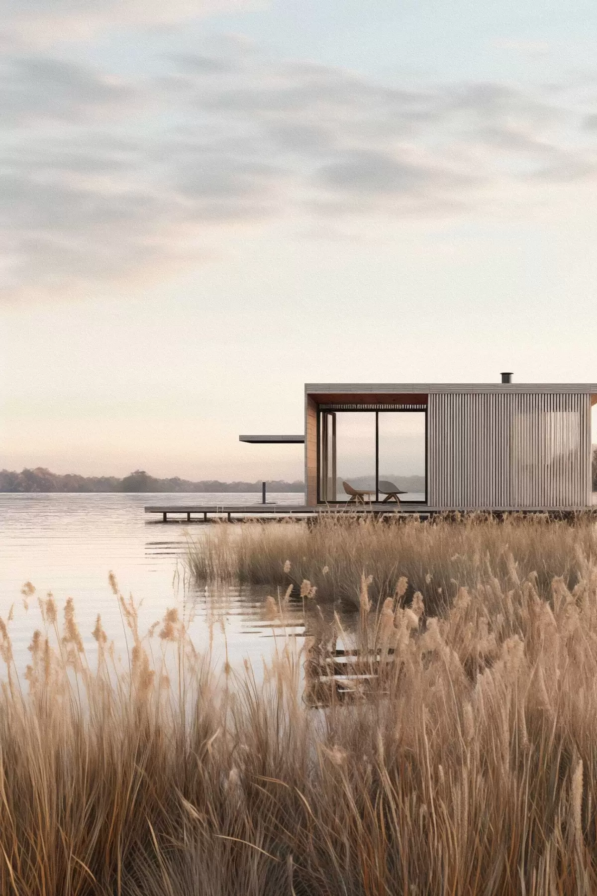 Poster Moderne Hütte am Seeufer inmitten von Schilf in der sanften Abenddämmerung f46513
