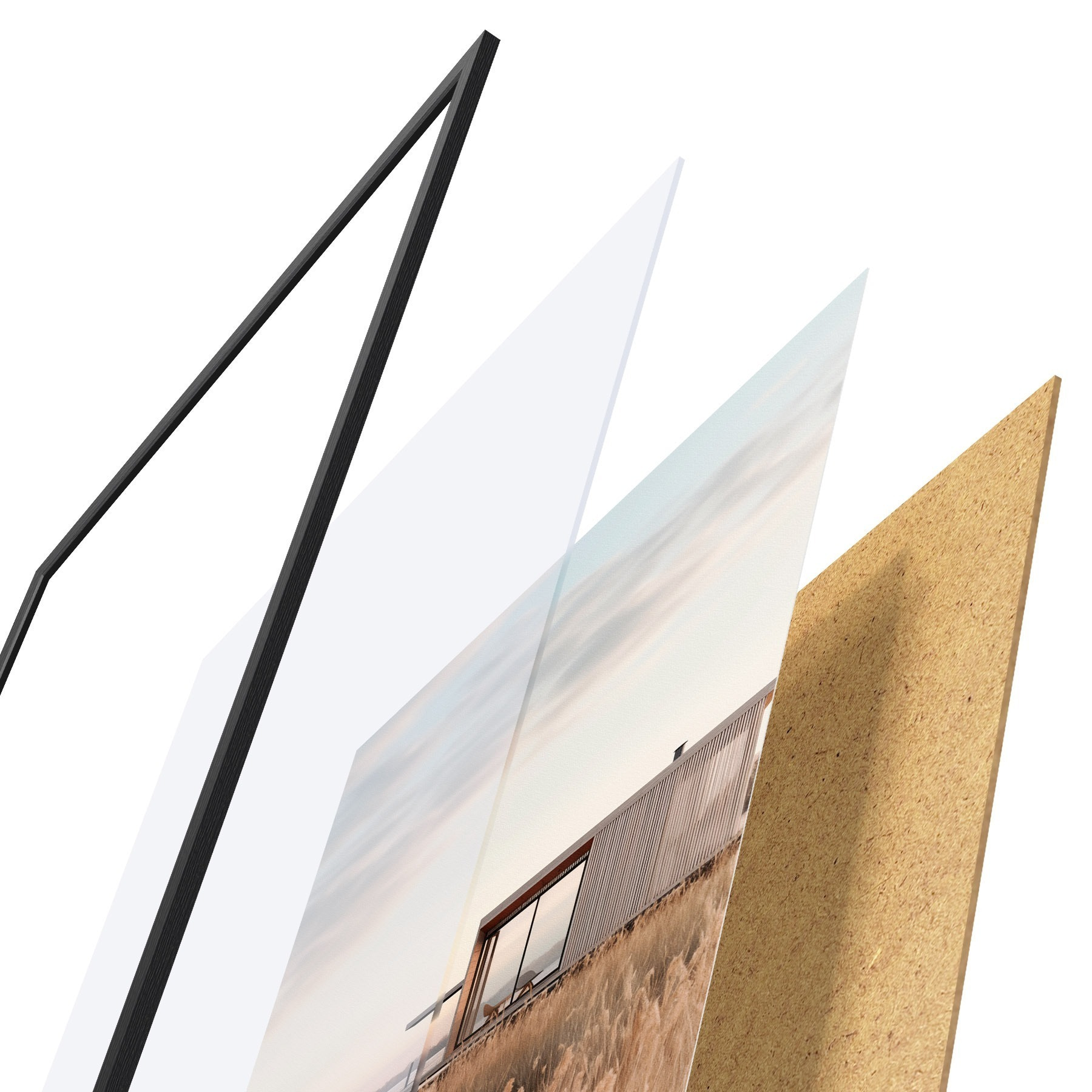 Das Poster besteht aus einem Rahmen, Plexiglas, einem gedruckten Bild und einer Rückwand aus Spanplatten. Dank der Halterungen auf der Rückseite kann das Poster sofort an die Wand gehängt werden.