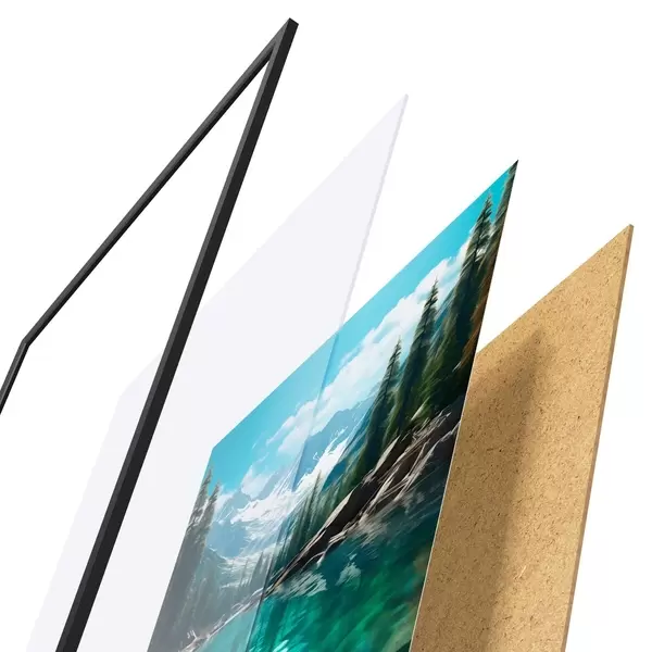 Das Poster besteht aus einem Rahmen, Plexiglas, einem gedruckten Bild und einer Rückwand aus Spanplatten. Dank der Halterungen auf der Rückseite kann das Poster sofort an die Wand gehängt werden.