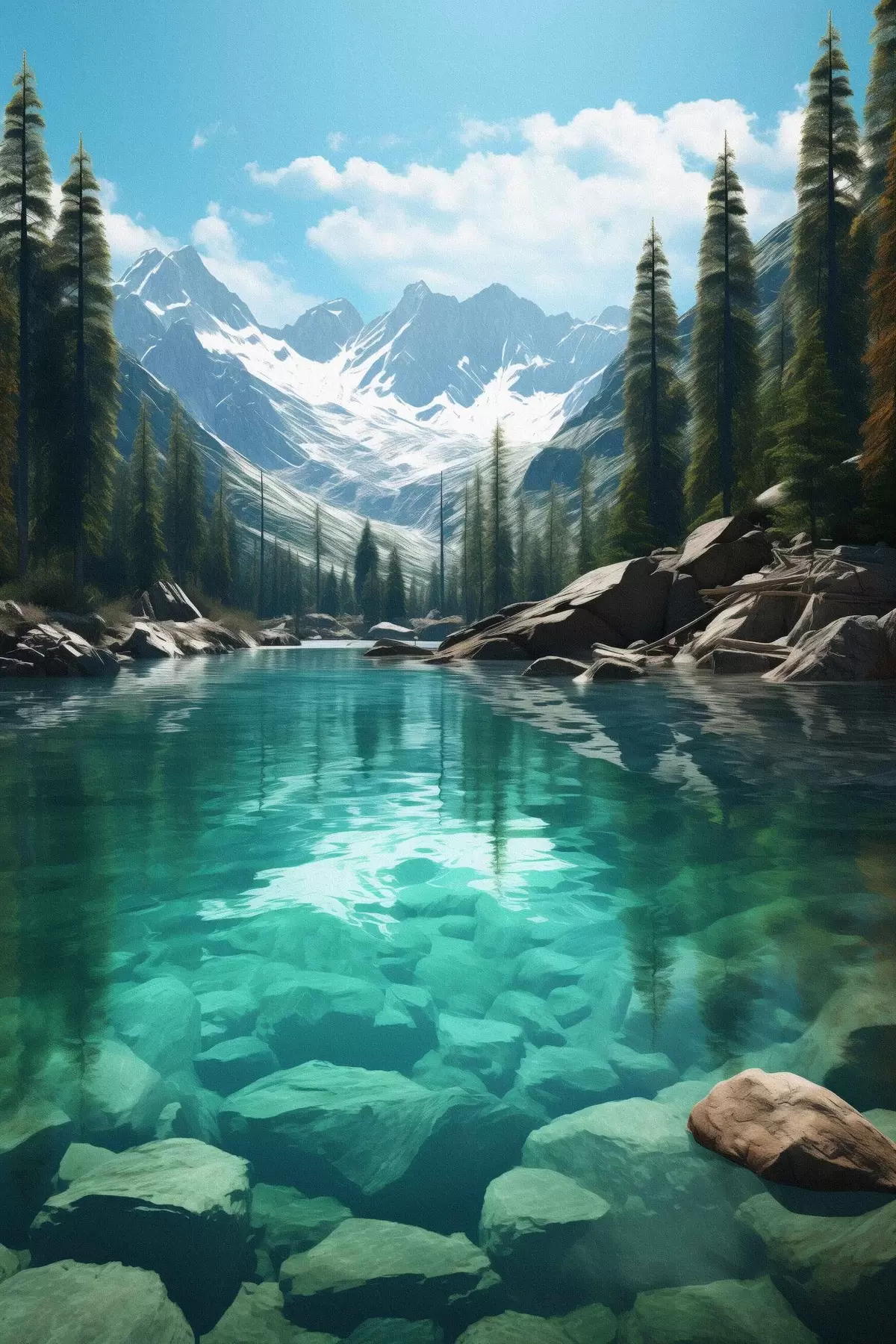 Poster Klarer Gebirgsfluss mit felsigem Bett und schneebedeckten Gipfeln Nr f46514