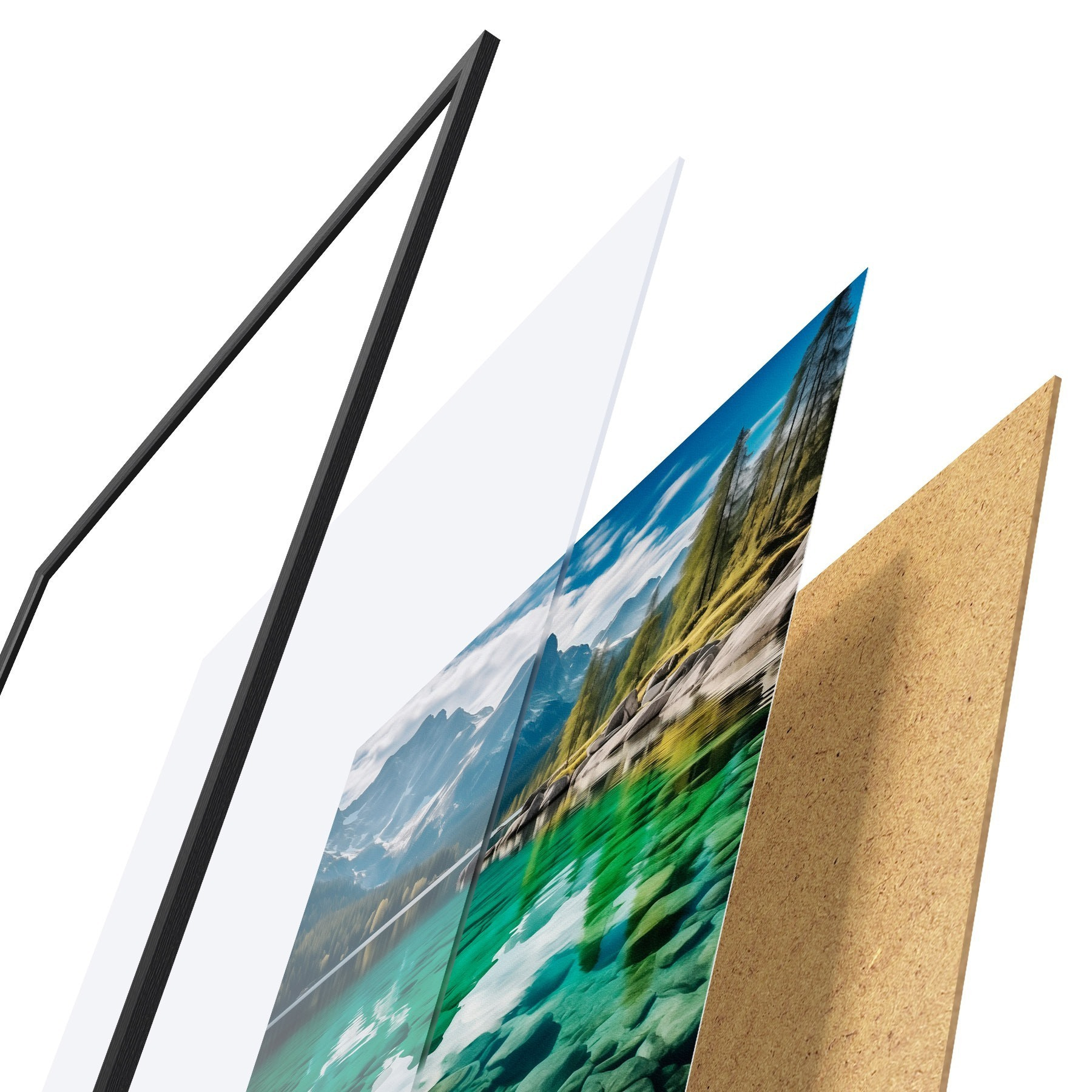 Das Poster besteht aus einem Rahmen, Plexiglas, einem gedruckten Bild und einer Rückwand aus Spanplatten. Dank der Halterungen auf der Rückseite kann das Poster sofort an die Wand gehängt werden.