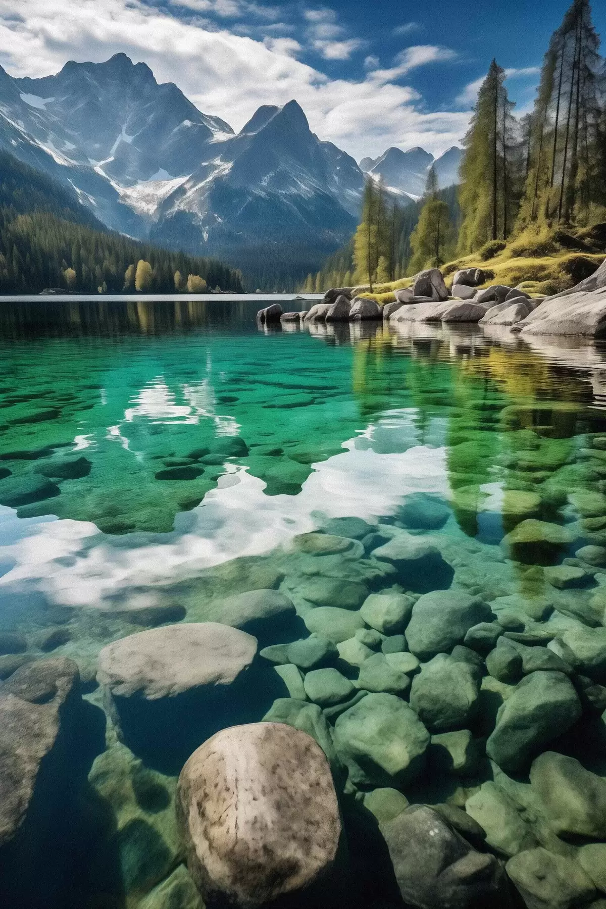 Poster Smaragdgrüner Alpensee mit Felsen darunter und hoch aufragenden Gipfeln f46515