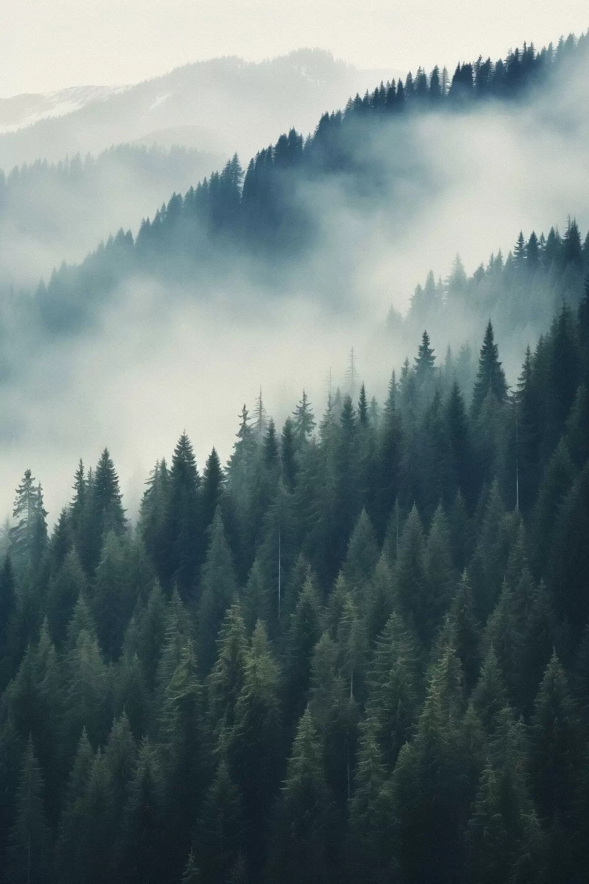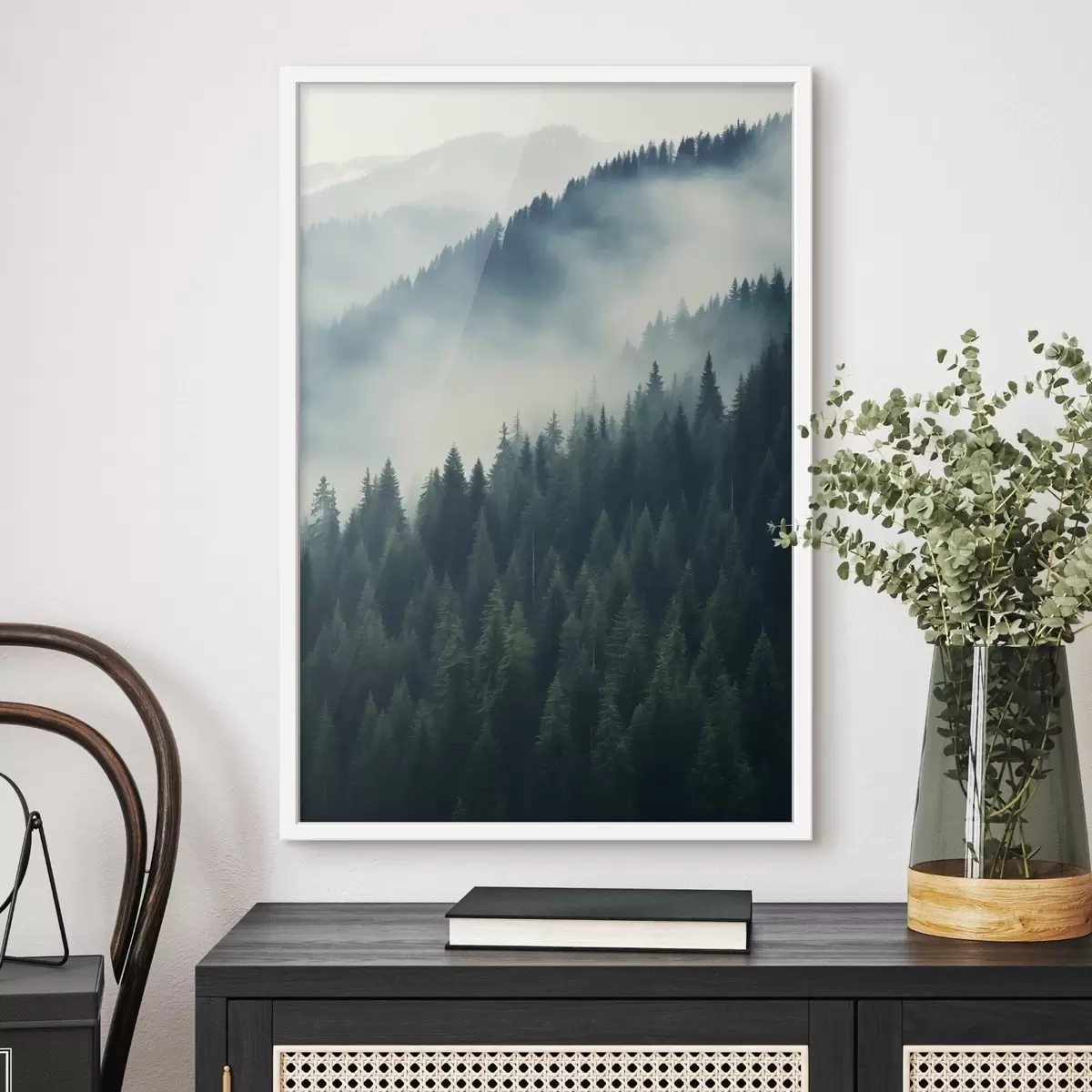 Poster Nebel über Nadelbaumhängen, tiefe Grüntöne Nr f46516
