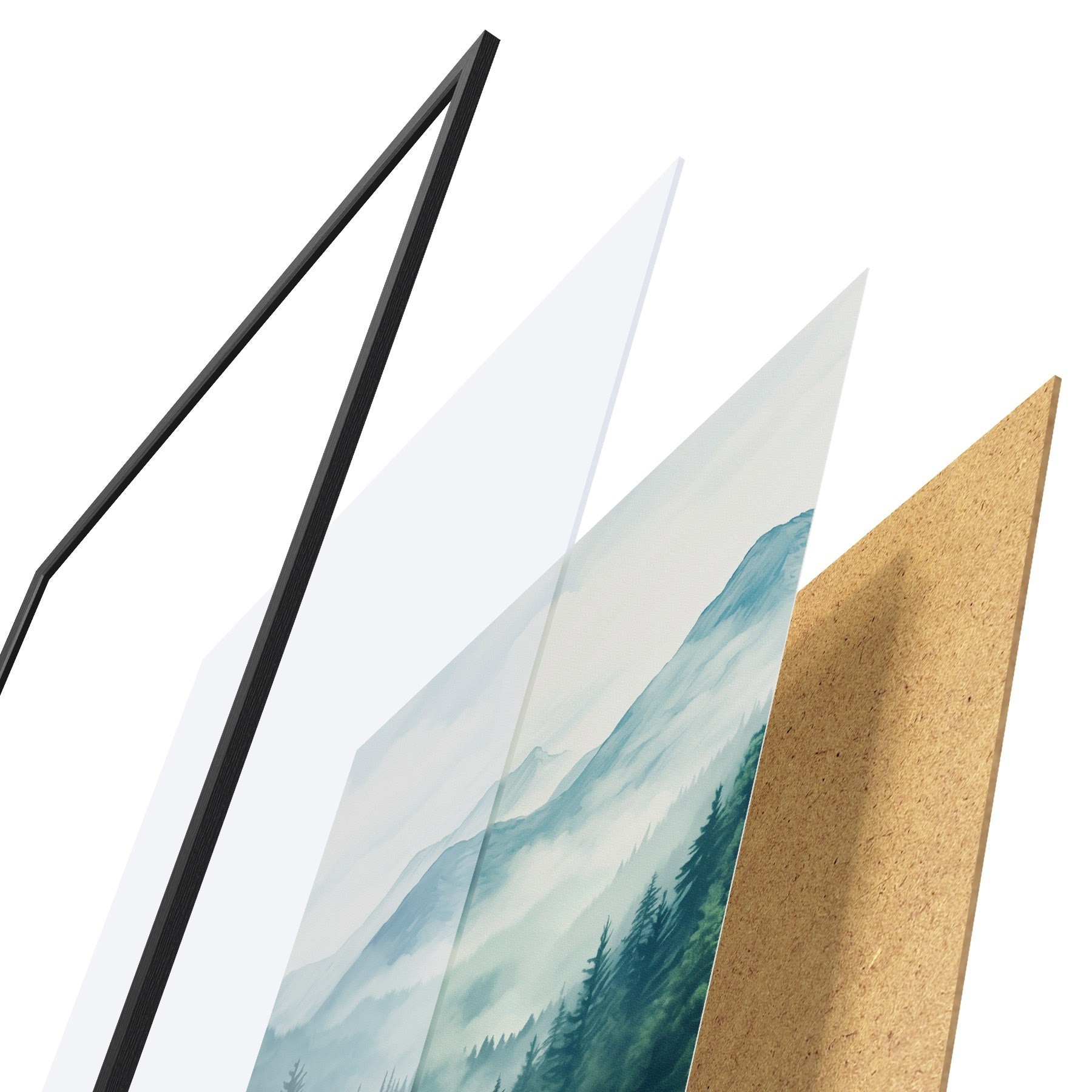 Das Poster besteht aus einem Rahmen, Plexiglas, einem gedruckten Bild und einer Rückwand aus Spanplatten. Dank der Halterungen auf der Rückseite kann das Poster sofort an die Wand gehängt werden.