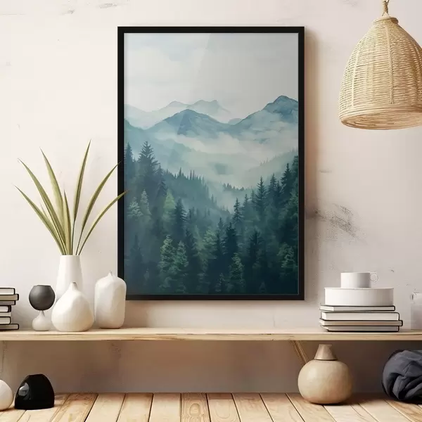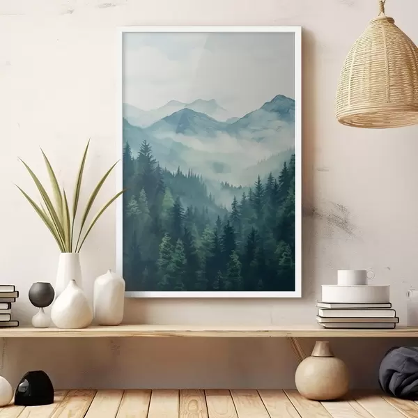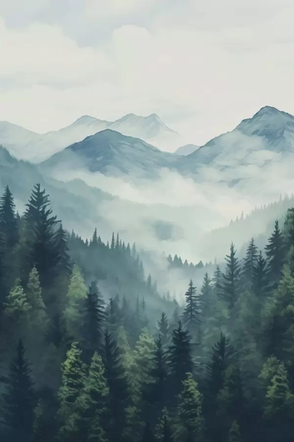 Poster Aquarellberge und Wald im sanften Morgennebel Nr f46519