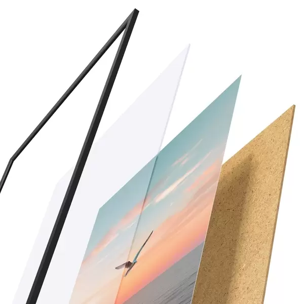 Das Poster besteht aus einem Rahmen, Plexiglas, einem gedruckten Bild und einer Rückwand aus Spanplatten. Dank der Halterungen auf der Rückseite kann das Poster sofort an die Wand gehängt werden.