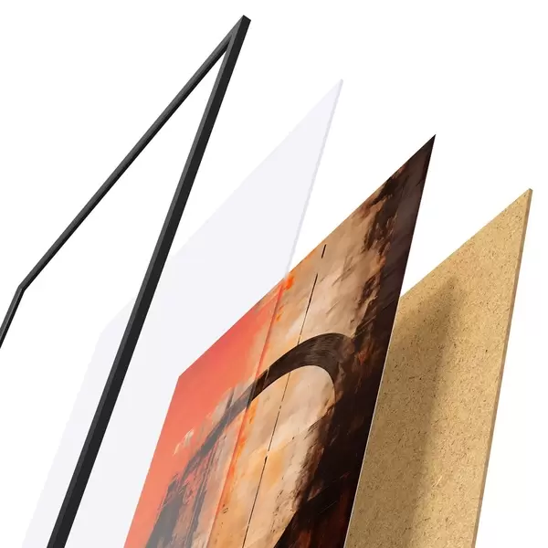 Das Poster besteht aus einem Rahmen, Plexiglas, einem gedruckten Bild und einer Rückwand aus Spanplatten. Dank der Halterungen auf der Rückseite kann das Poster sofort an die Wand gehängt werden.