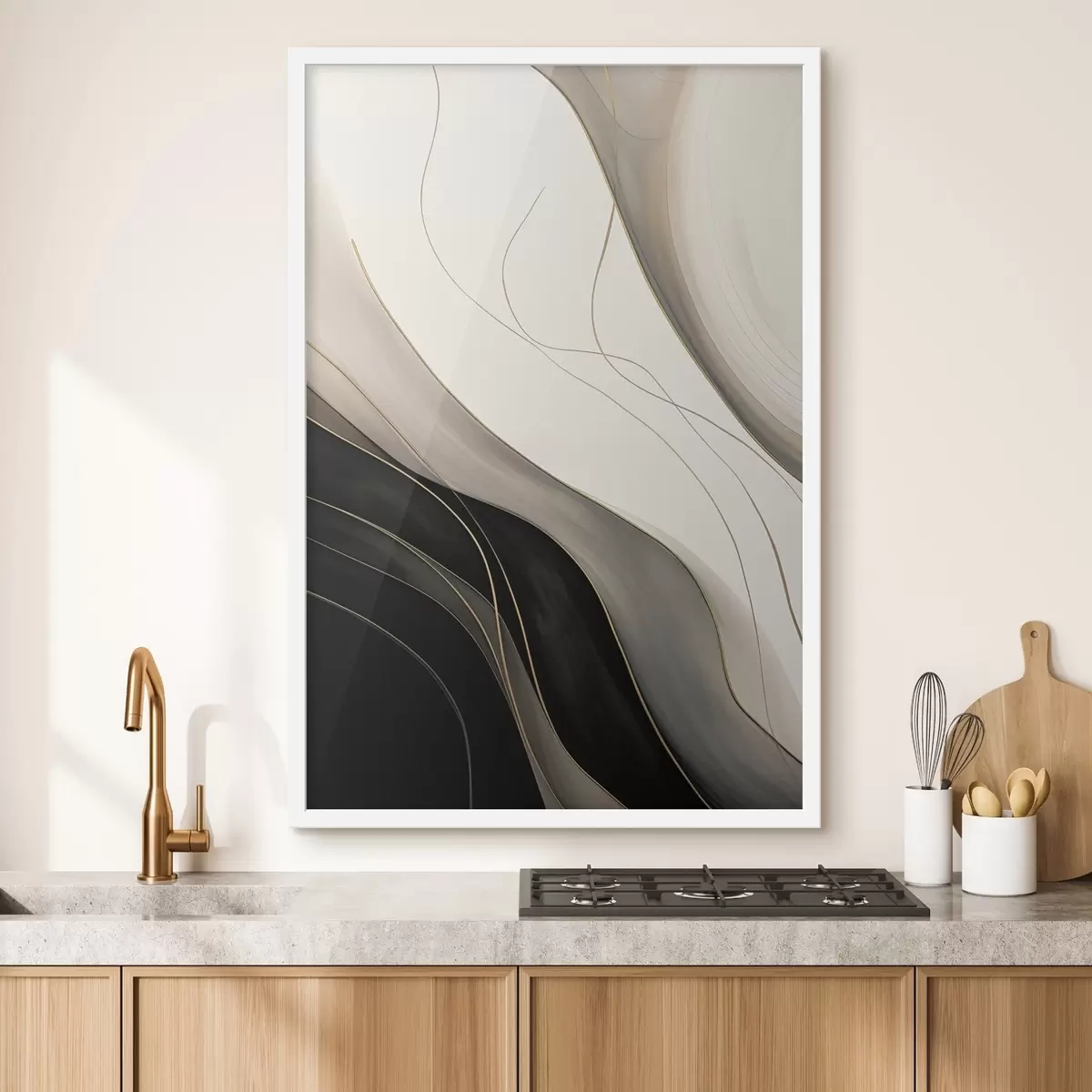 Poster Wellen in Schwarz und Beige mit feinen ockerfarbenen Linien f46541