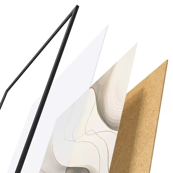 Das Poster besteht aus einem Rahmen, Plexiglas, einem gedruckten Bild und einer Rückwand aus Spanplatten. Dank der Halterungen auf der Rückseite kann das Poster sofort an die Wand gehängt werden.