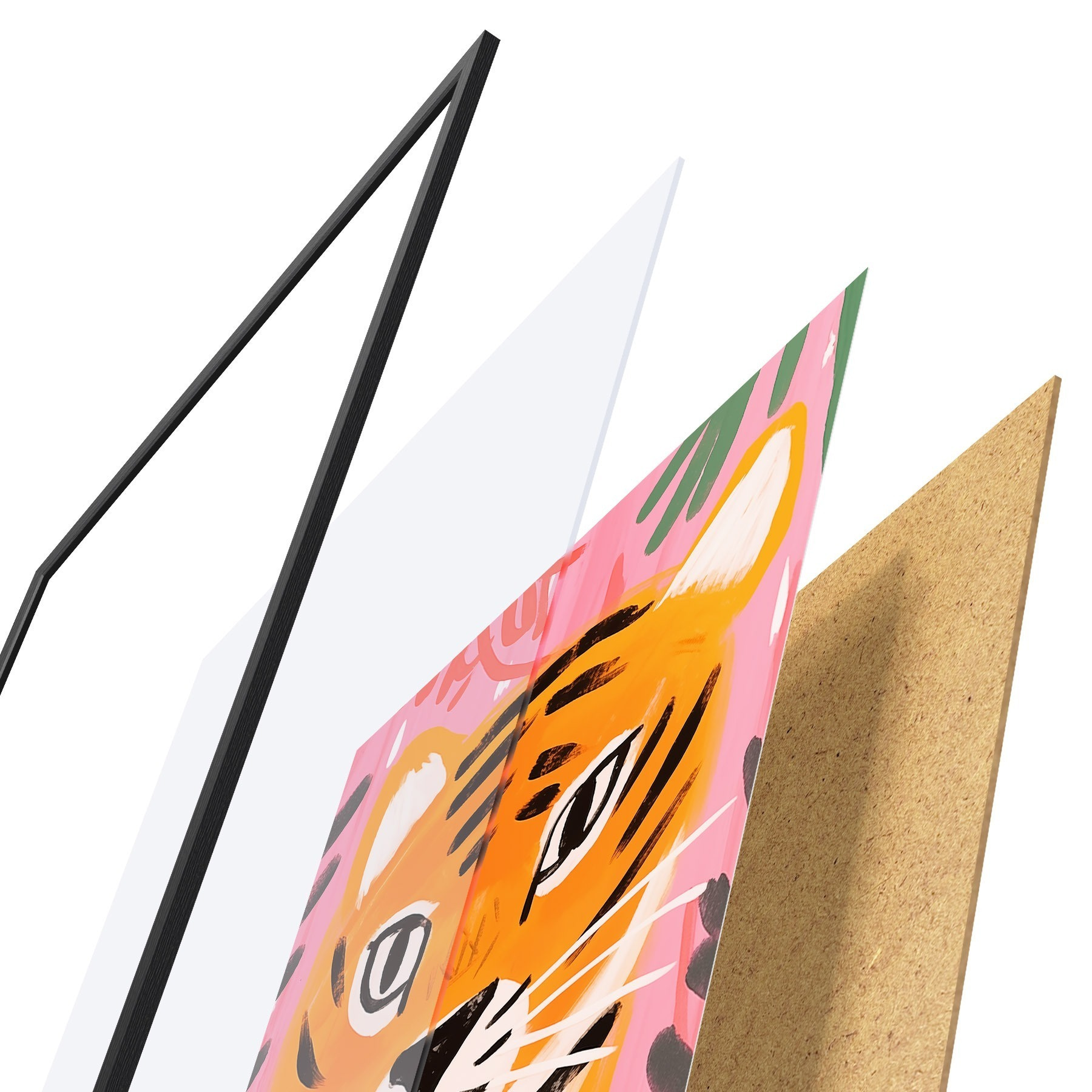 Das Poster besteht aus einem Rahmen, Plexiglas, einem gedruckten Bild und einer Rückwand aus Spanplatten. Dank der Halterungen auf der Rückseite kann das Poster sofort an die Wand gehängt werden.