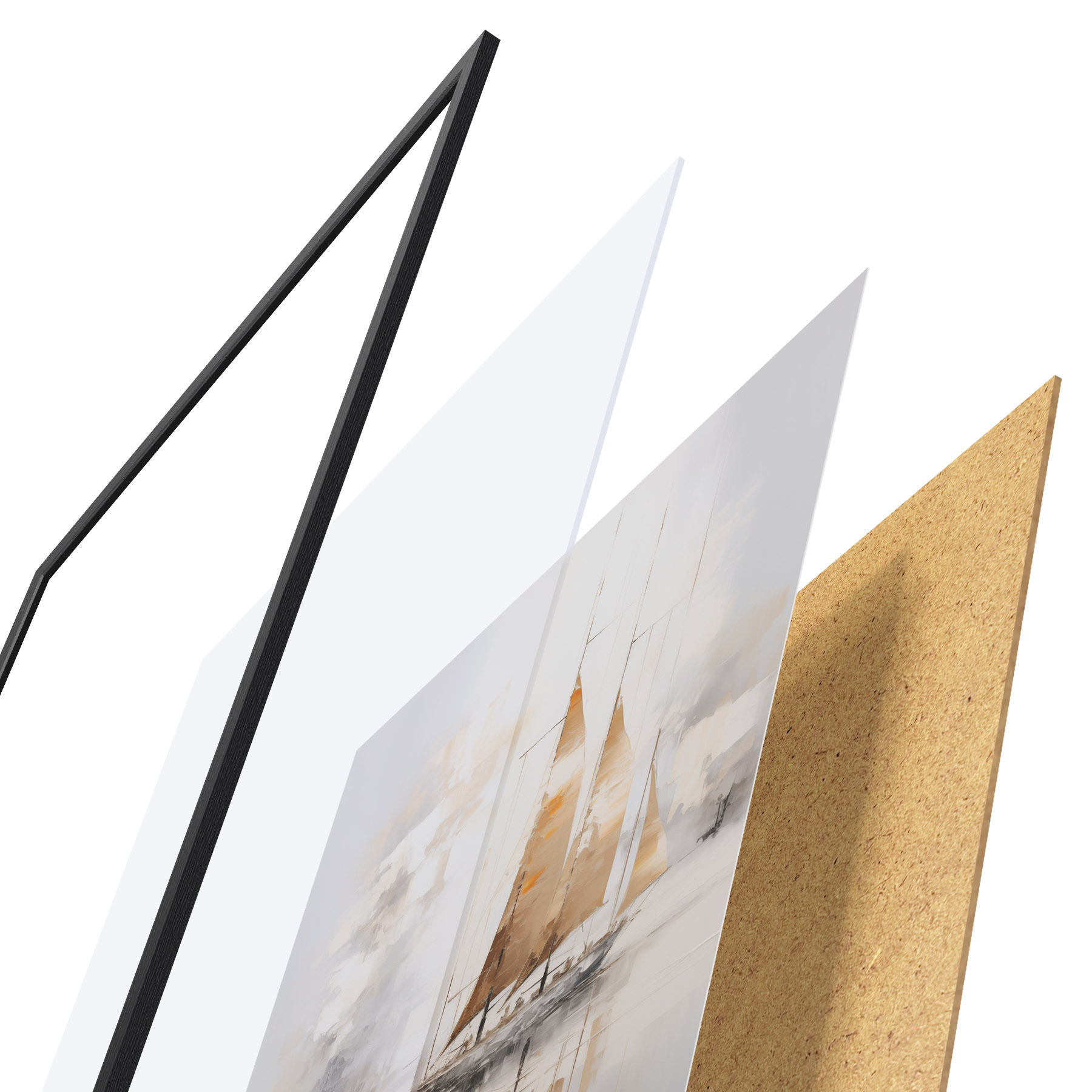 Das Poster besteht aus einem Rahmen, Plexiglas, einem gedruckten Bild und einer Rückwand aus Spanplatten. Dank der Halterungen auf der Rückseite kann das Poster sofort an die Wand gehängt werden.