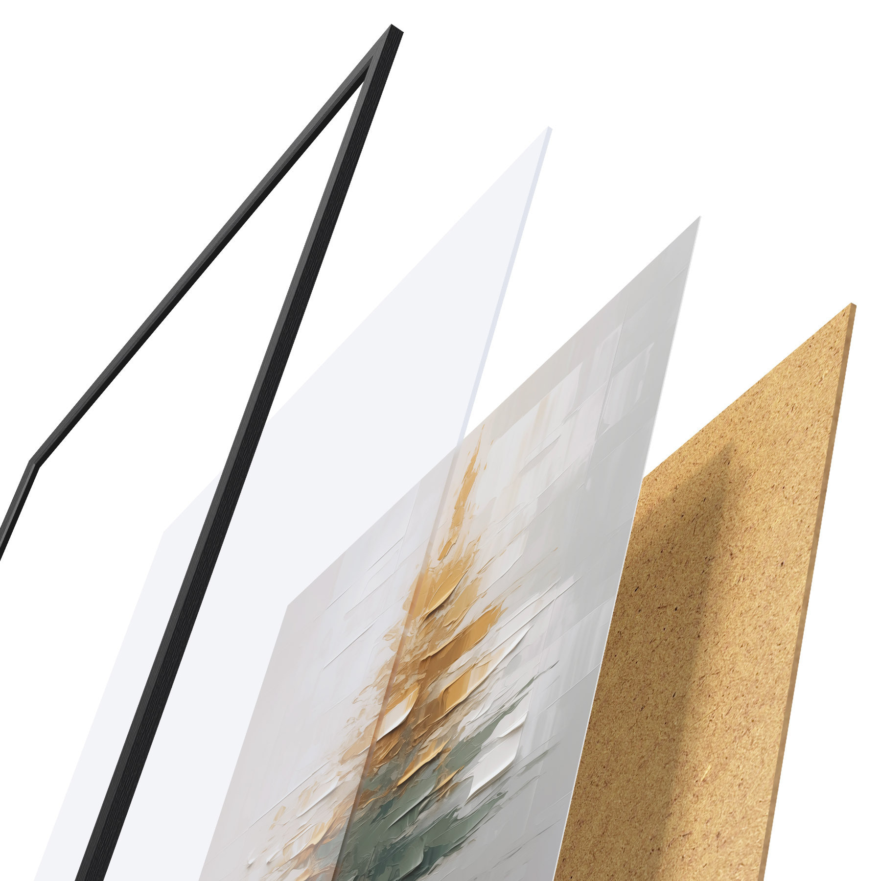 Das Poster besteht aus einem Rahmen, Plexiglas, einem gedruckten Bild und einer Rückwand aus Spanplatten. Dank der Halterungen auf der Rückseite kann das Poster sofort an die Wand gehängt werden.