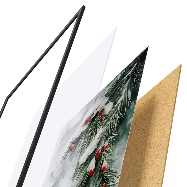 Das Poster besteht aus einem Rahmen, Plexiglas, einem gedruckten Bild und einer Rückwand aus Spanplatten. Dank der Halterungen auf der Rückseite kann das Poster sofort an die Wand gehängt werden.