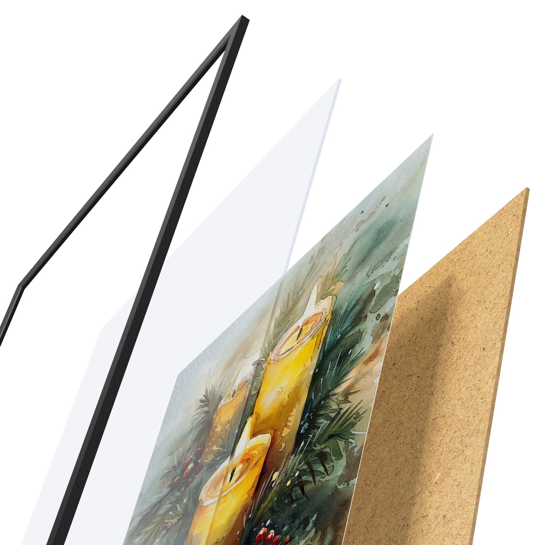 Das Poster besteht aus einem Rahmen, Plexiglas, einem gedruckten Bild und einer Rückwand aus Spanplatten. Dank der Halterungen auf der Rückseite kann das Poster sofort an die Wand gehängt werden.
