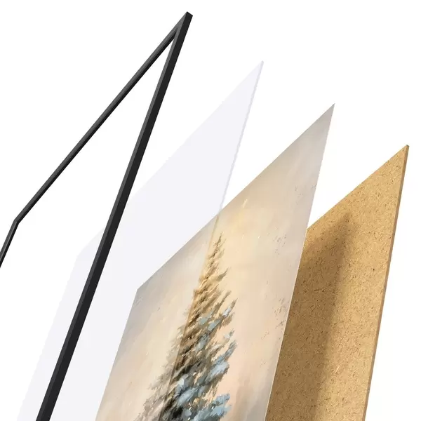 Das Poster besteht aus einem Rahmen, Plexiglas, einem gedruckten Bild und einer Rückwand aus Spanplatten. Dank der Halterungen auf der Rückseite kann das Poster sofort an die Wand gehängt werden.