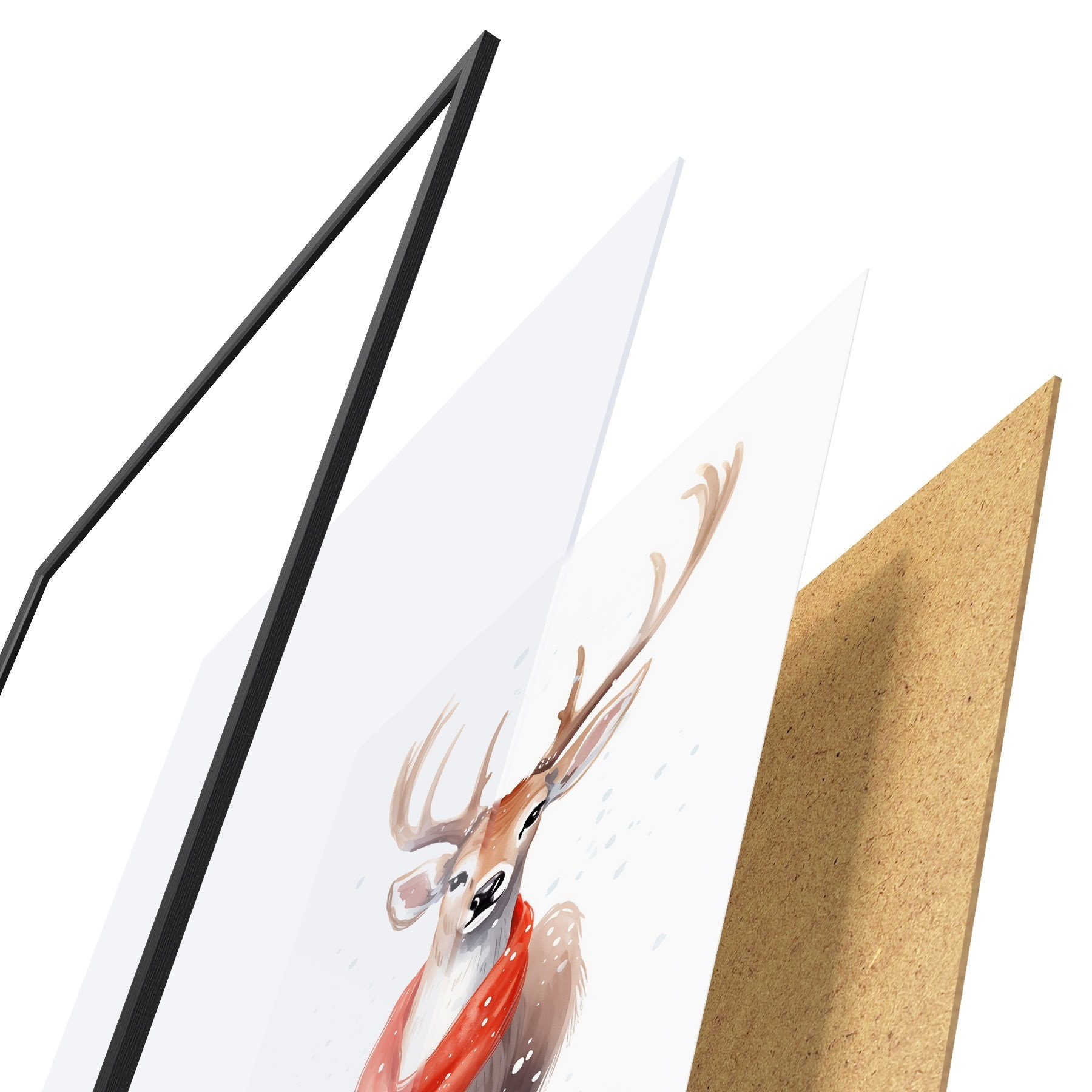 Das Poster besteht aus einem Rahmen, Plexiglas, einem gedruckten Bild und einer Rückwand aus Spanplatten. Dank der Halterungen auf der Rückseite kann das Poster sofort an die Wand gehängt werden.
