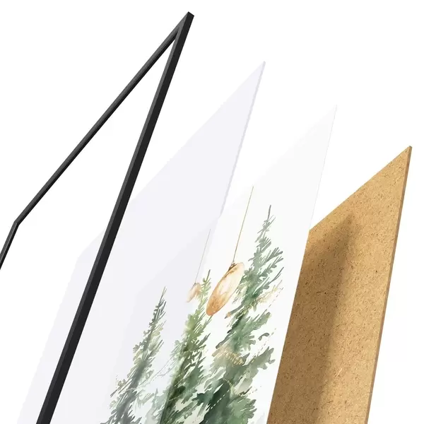 Das Poster besteht aus einem Rahmen, Plexiglas, einem gedruckten Bild und einer Rückwand aus Spanplatten. Dank der Halterungen auf der Rückseite kann das Poster sofort an die Wand gehängt werden.
