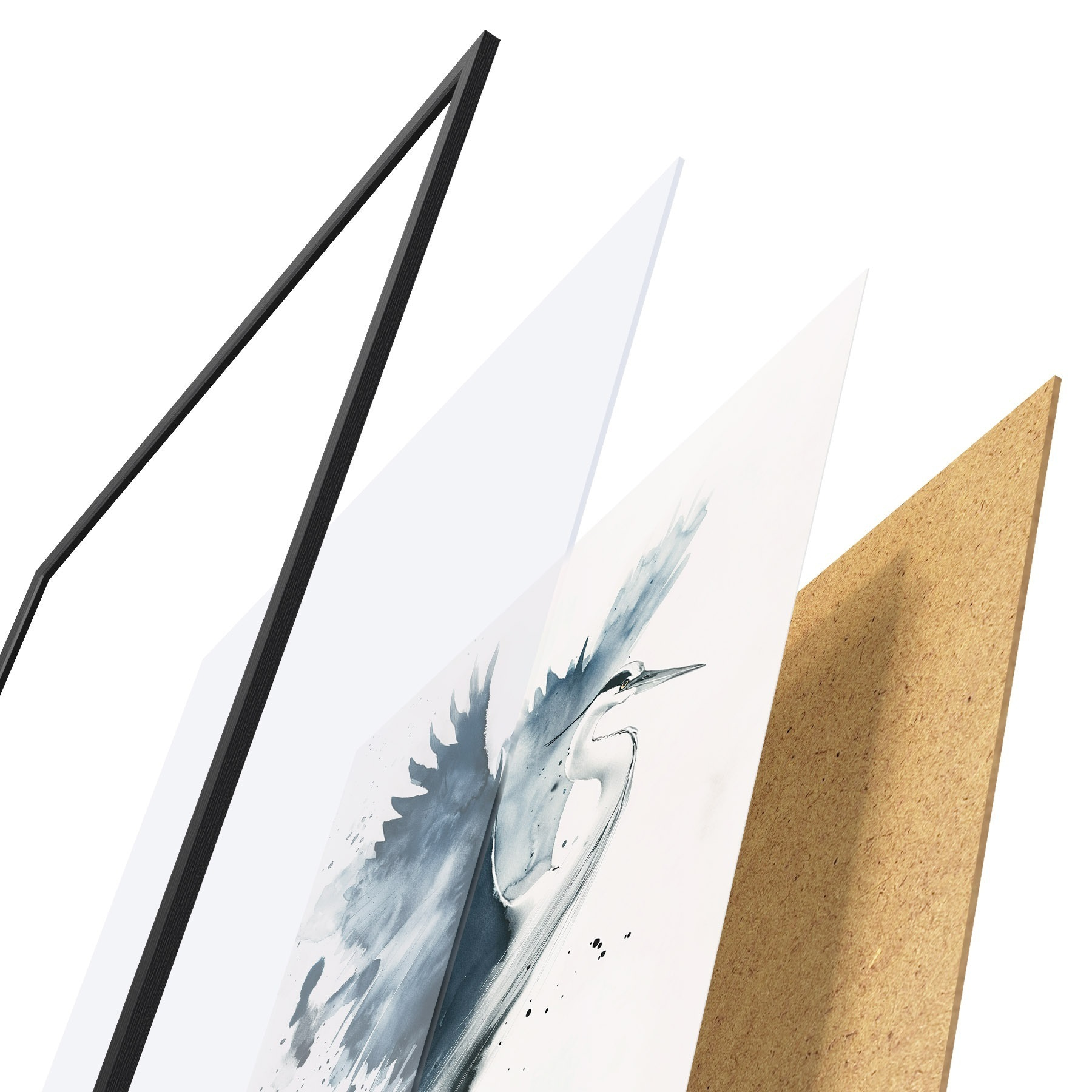 Das Poster besteht aus einem Rahmen, Plexiglas, einem gedruckten Bild und einer Rückwand aus Spanplatten. Dank der Halterungen auf der Rückseite kann das Poster sofort an die Wand gehängt werden.