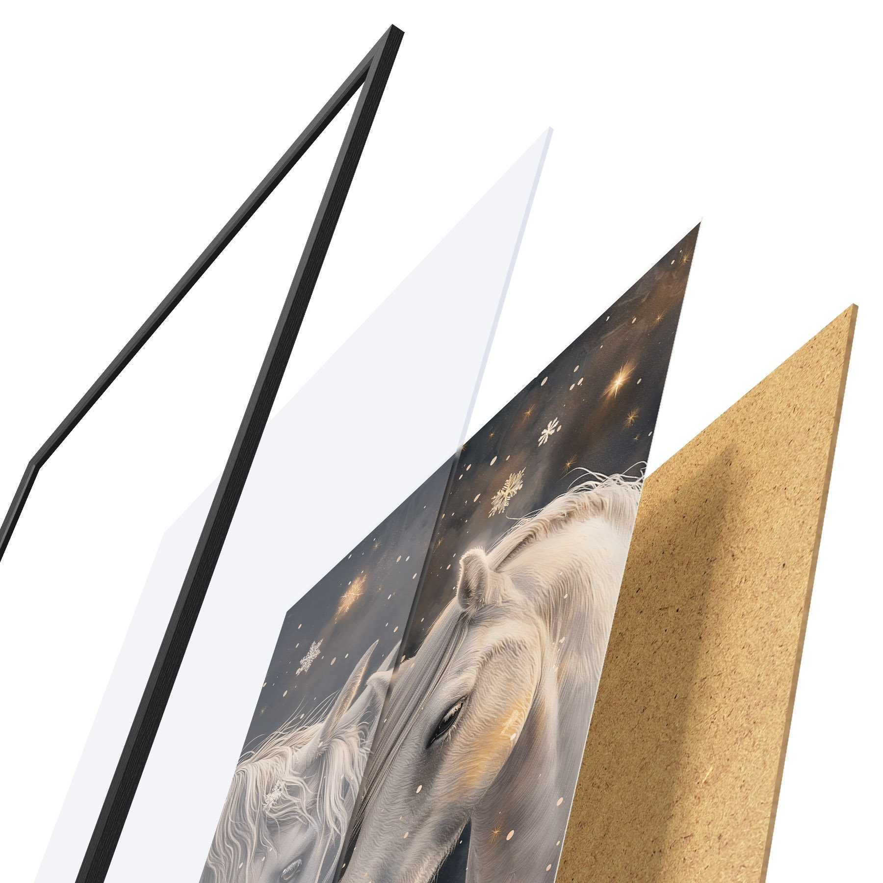 Das Poster besteht aus einem Rahmen, Plexiglas, einem gedruckten Bild und einer Rückwand aus Spanplatten. Dank der Halterungen auf der Rückseite kann das Poster sofort an die Wand gehängt werden.