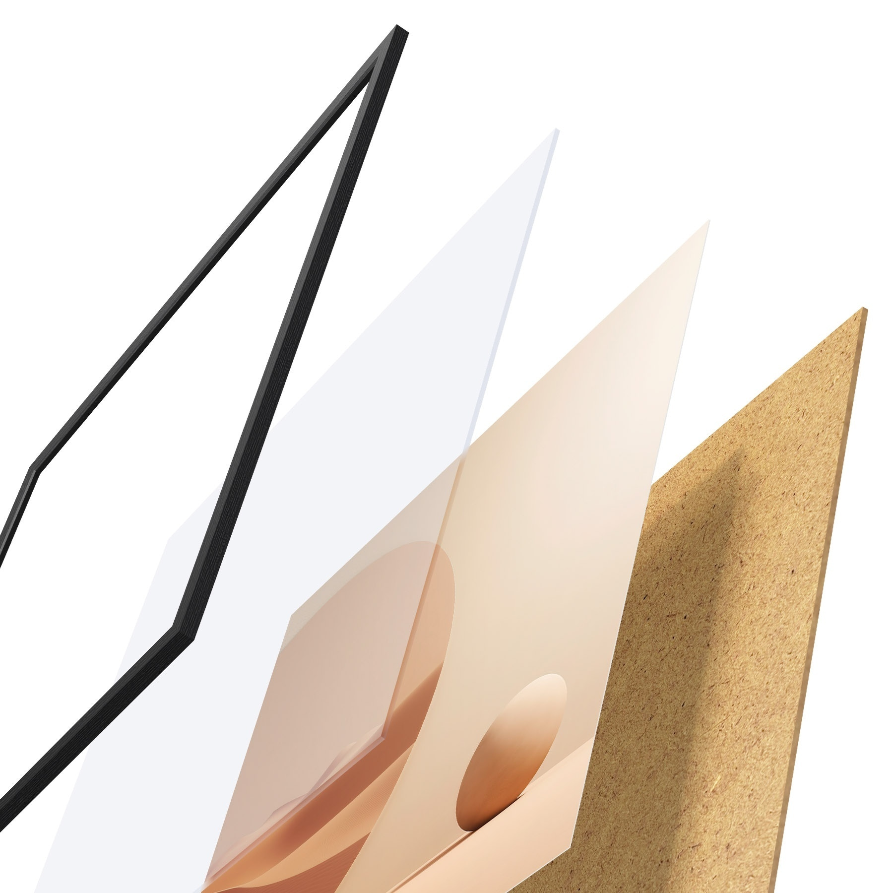 Das Poster besteht aus einem Rahmen, Plexiglas, einem gedruckten Bild und einer Rückwand aus Spanplatten. Dank der Halterungen auf der Rückseite kann das Poster sofort an die Wand gehängt werden.