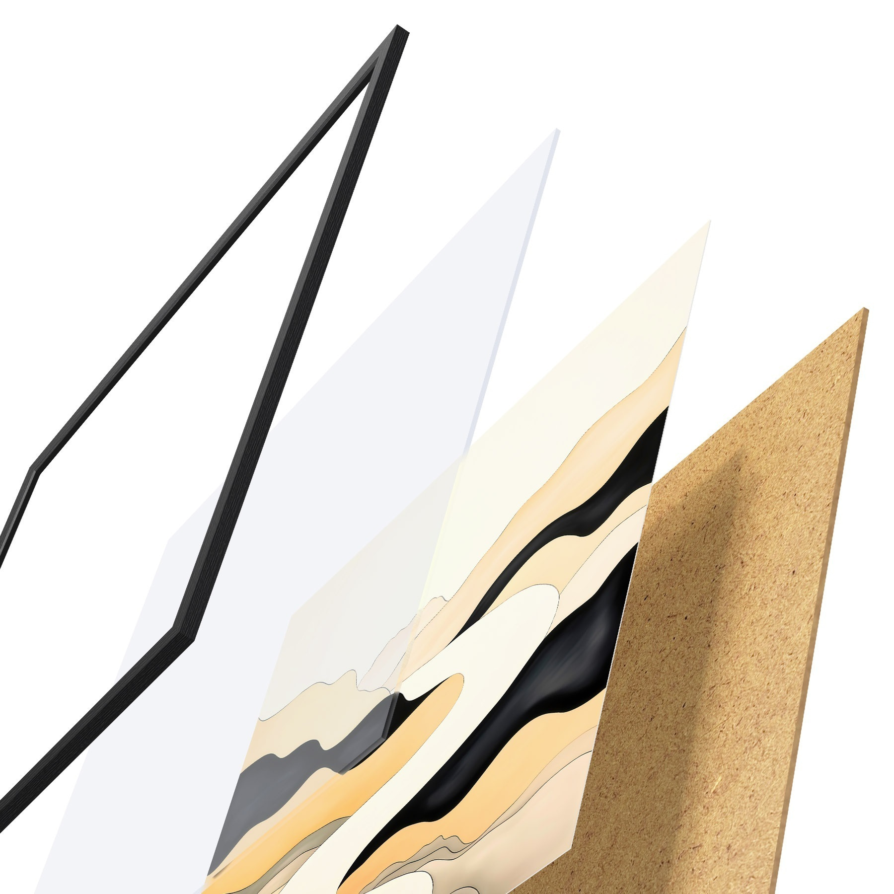 Das Poster besteht aus einem Rahmen, Plexiglas, einem gedruckten Bild und einer Rückwand aus Spanplatten. Dank der Halterungen auf der Rückseite kann das Poster sofort an die Wand gehängt werden.