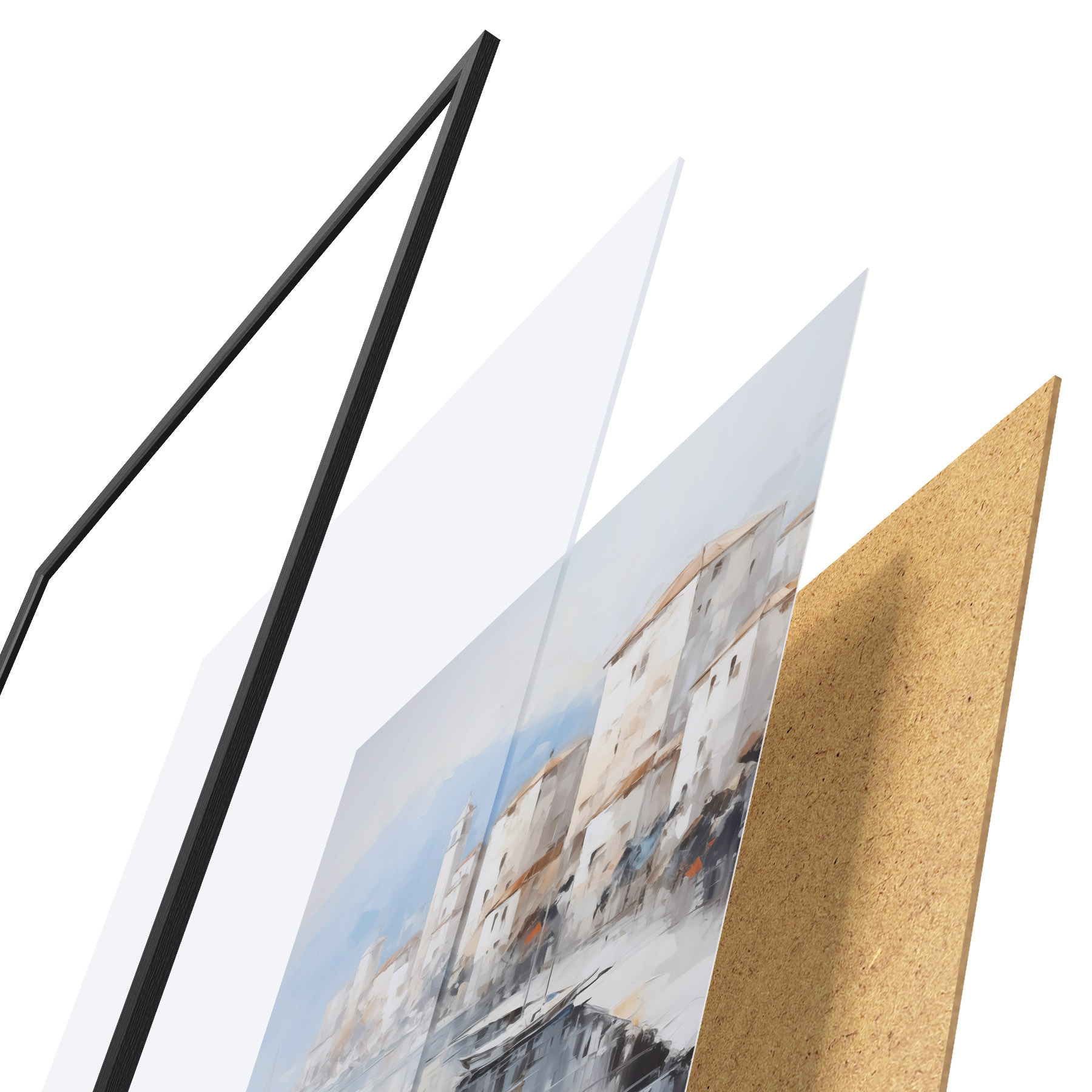 Das Poster besteht aus einem Rahmen, Plexiglas, einem gedruckten Bild und einer Rückwand aus Spanplatten. Dank der Halterungen auf der Rückseite kann das Poster sofort an die Wand gehängt werden.