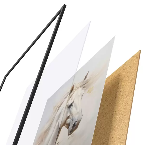 Das Poster besteht aus einem Rahmen, Plexiglas, einem gedruckten Bild und einer Rückwand aus Spanplatten. Dank der Halterungen auf der Rückseite kann das Poster sofort an die Wand gehängt werden.