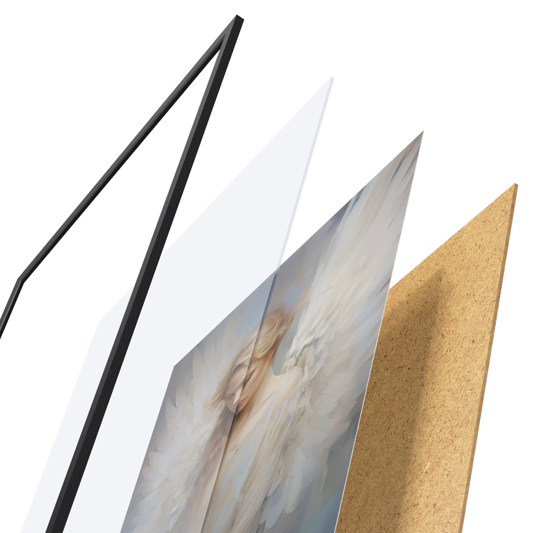 Das Poster besteht aus einem Rahmen, Plexiglas, einem gedruckten Bild und einer Rückwand aus Spanplatten. Dank der Halterungen auf der Rückseite kann das Poster sofort an die Wand gehängt werden.