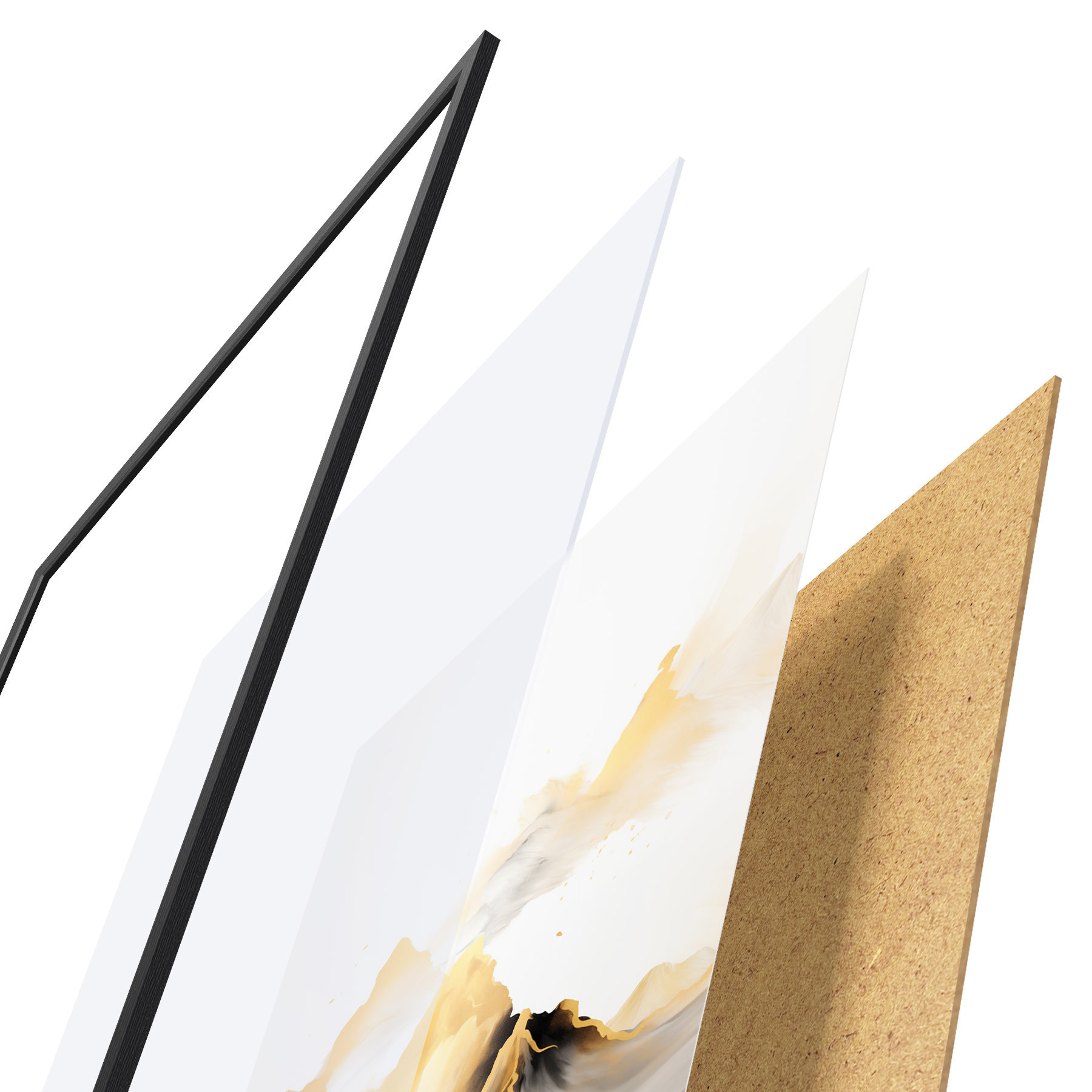 Das Poster besteht aus einem Rahmen, Plexiglas, einem gedruckten Bild und einer Rückwand aus Spanplatten. Dank der Halterungen auf der Rückseite kann das Poster sofort an die Wand gehängt werden.
