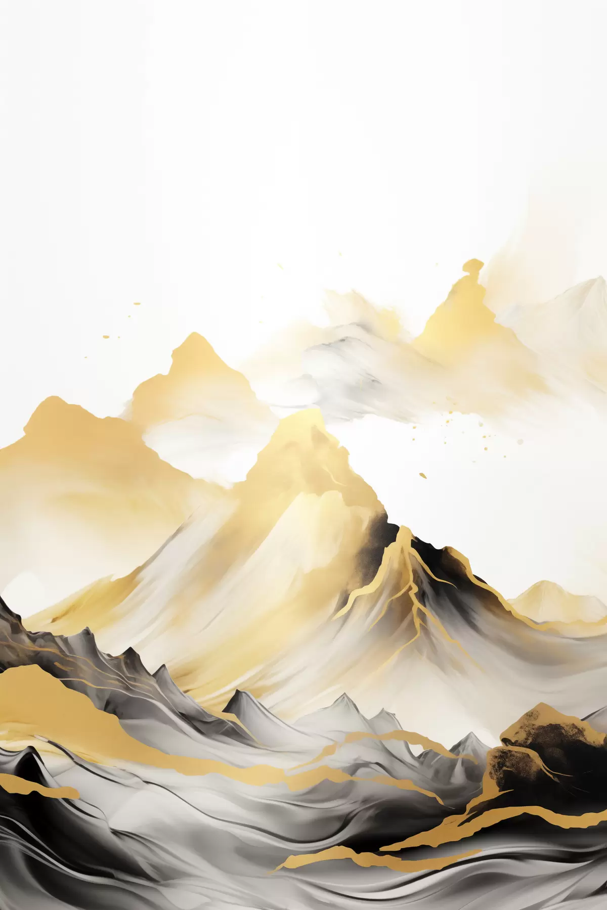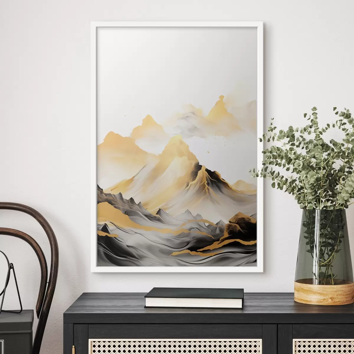 Poster Strukturierte gelbe und schwarze Berge mit schneebedeckten Gipfeln, Tuschemalerei-Stil, minimalistische Bergkette Nr f46684