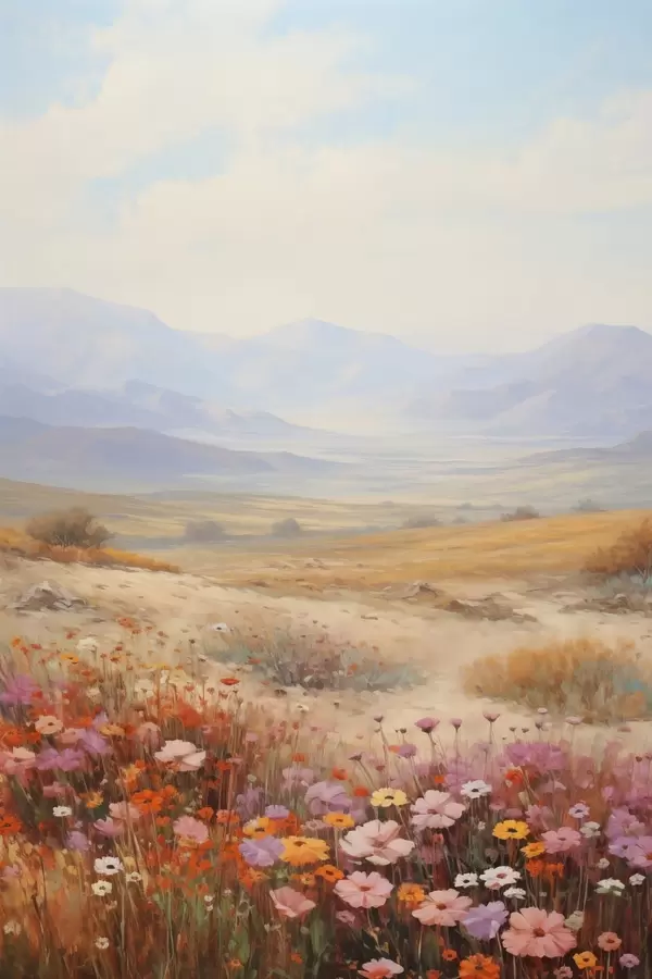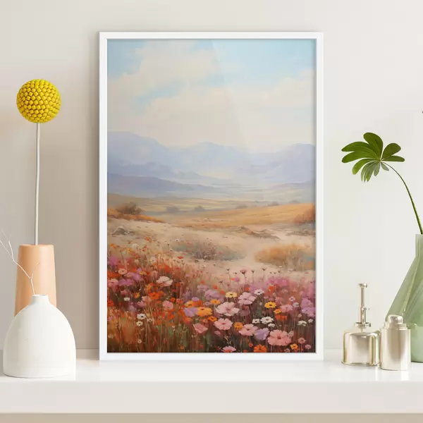 Poster Landschaft, ein Feld voller bunter Blumen mit Bergen im Hintergrund, sanfte Pastellfarben Nr f46685