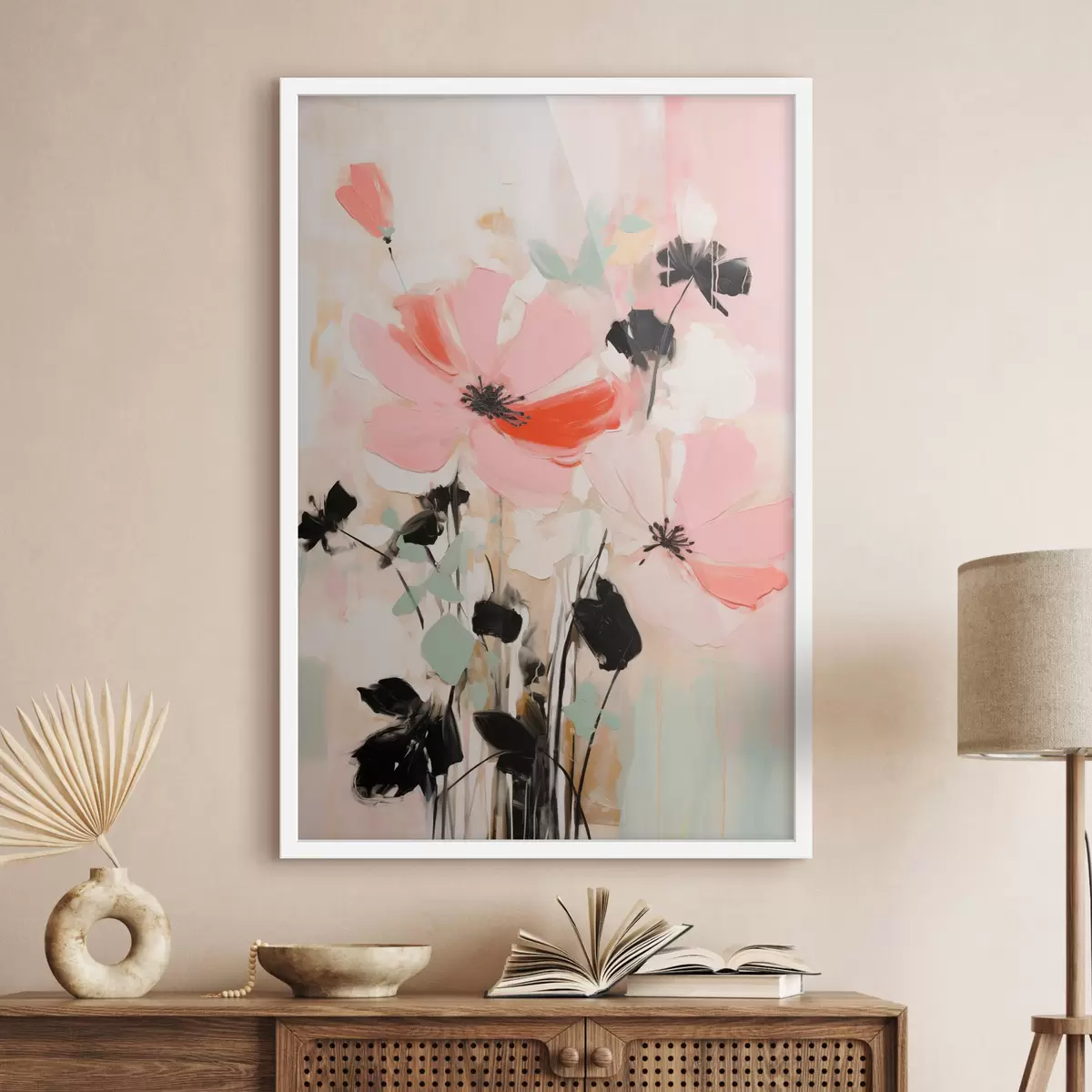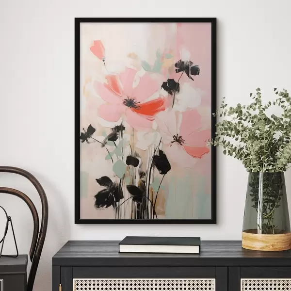 Poster Rosa und schwarze Blumen mit Blättern, sanfte Pastellfarben, abstraktes Blumenarrangement, minimalistische Kunst Nr f46687